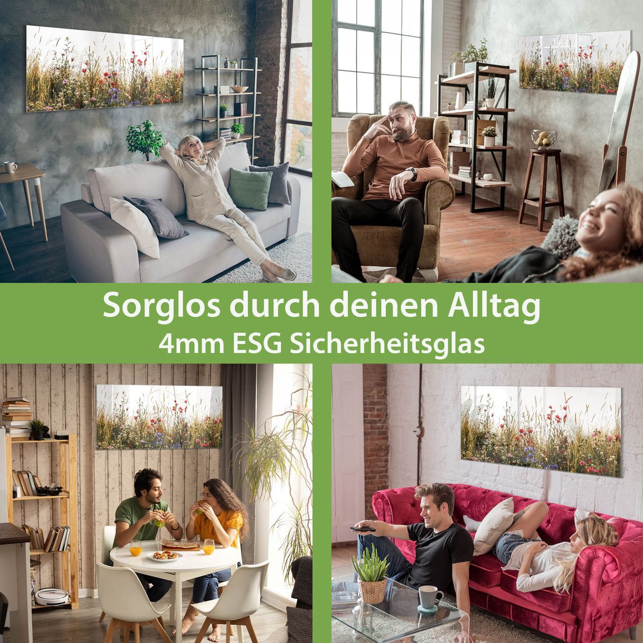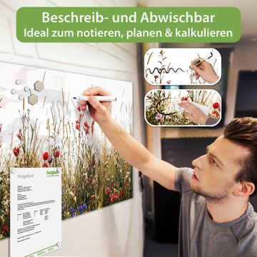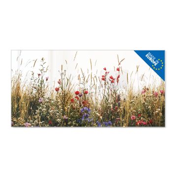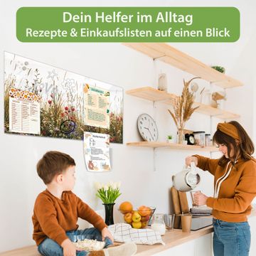 Material: 4mm Sicherheitsglas mit Metallrückwand Eigenschaften: beschreibbar, magnetisch, kratzfest Maße: 100x50x0,6cm, 7,50kg schwer Motiv Nummer 13202 Sommerliche Blumenwiese Zubehör: inklusive 4 Neodym-Magnete