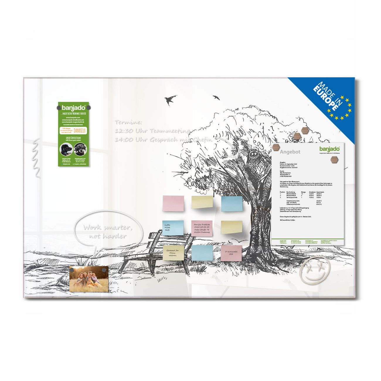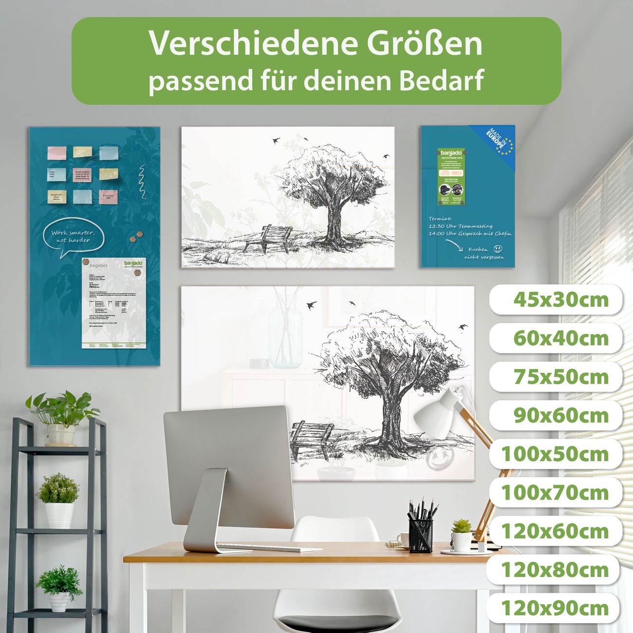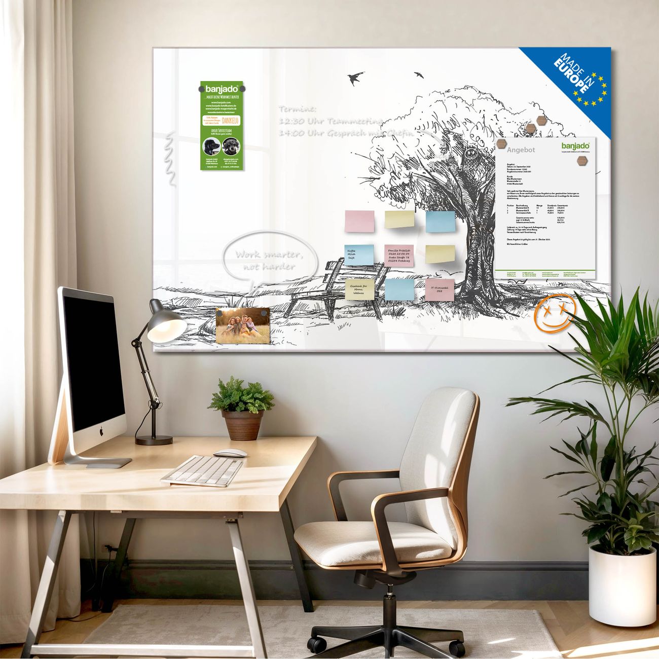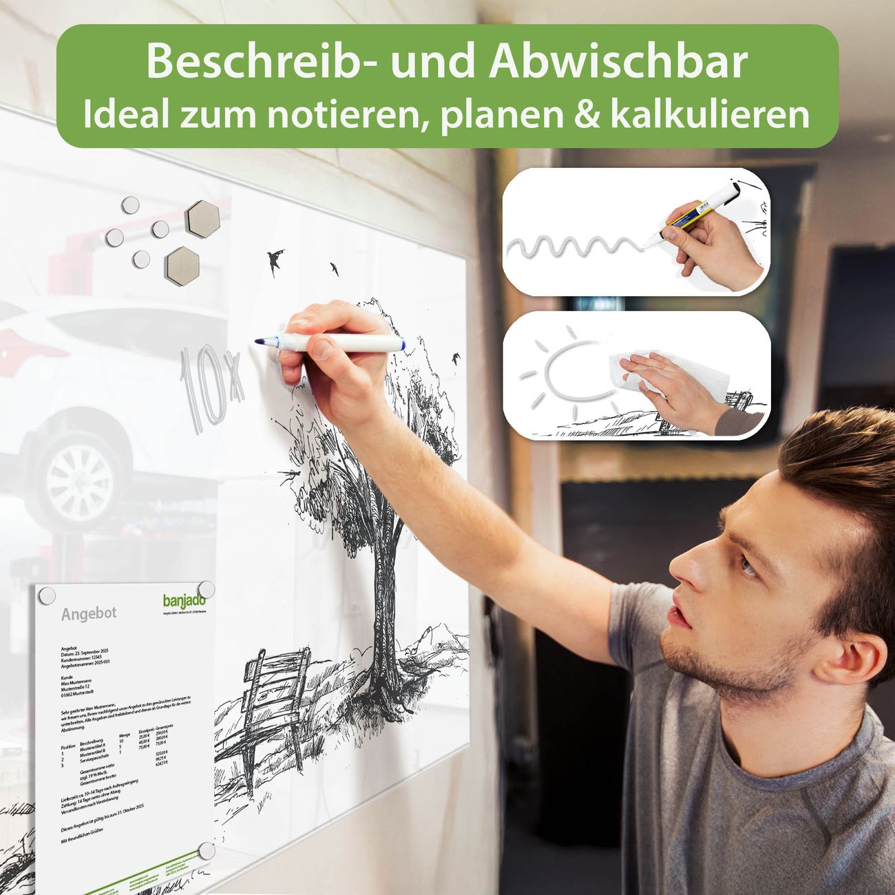 Jede Glas Magnettafel wird in unserer Werkstatt von Hand gefertigt und sorgfältig geprüft. So erhalten Sie ein echtes Qualitätsprodukt, das Funktion und Ästhetik perfekt vereint.?? Warum banjado?