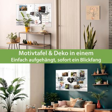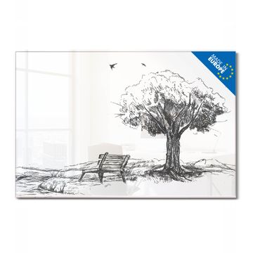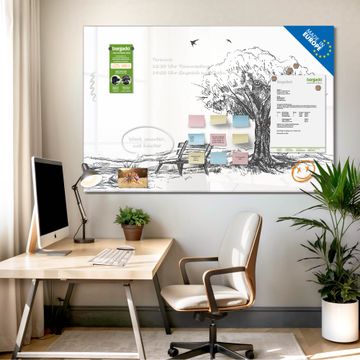 Material: 4mm Sicherheitsglas mit Metallrückwand Eigenschaften: beschreibbar, magnetisch, kratzfest Maße: 120x80x0,6cm, 14,40kg schwer Motiv Nummer 13341 Sommerliche Parkszene Zubehör: inklusive 4 Neodym-Magnete