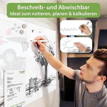 Auf der glatten Glasoberfläche lassen sich Termine, Rezepte oder Notizen ganz einfach mit Kreidestiften festhalten und rückstandslos entfernen. Starke Neodym-Magnete halten Ihre wichtigsten Erinnerungen sicher an Ort und Stelle. So entsteht Ihre ganz persönliche Ideenwand - jeden Tag neu.