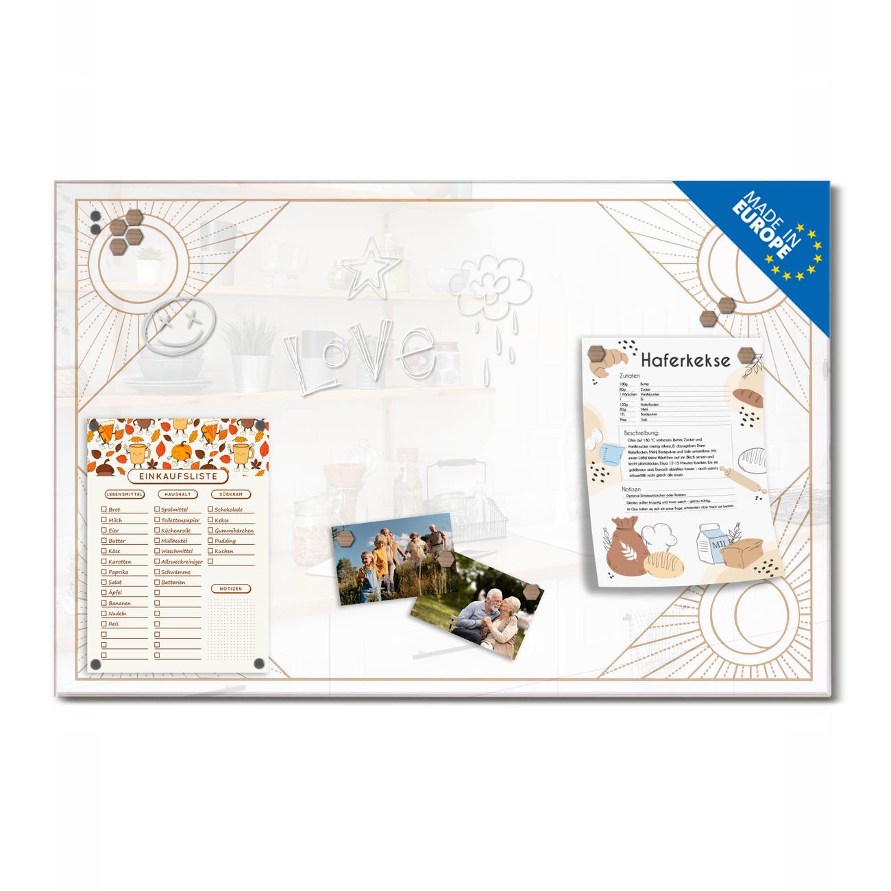 Auf der glatten Glasoberfläche lassen sich Termine, Rezepte oder Notizen ganz einfach mit Kreidestiften festhalten und rückstandslos entfernen. Starke Neodym-Magnete halten Ihre wichtigsten Erinnerungen sicher an Ort und Stelle. So entsteht Ihre ganz persönliche Ideenwand - jeden Tag neu.