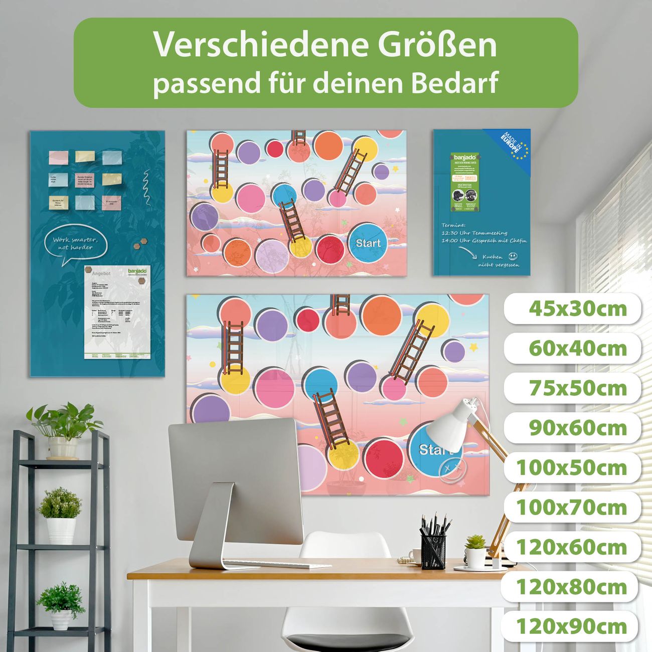 Material: 4mm Sicherheitsglas mit Metallrückwand Eigenschaften: beschreibbar, magnetisch, kratzfest Maße: 90x60x0,6cm, 8,10kg schwer Motiv Nummer 13003 Spielbrett 1 Zubehör: inklusive 4 Neodym-Magnete