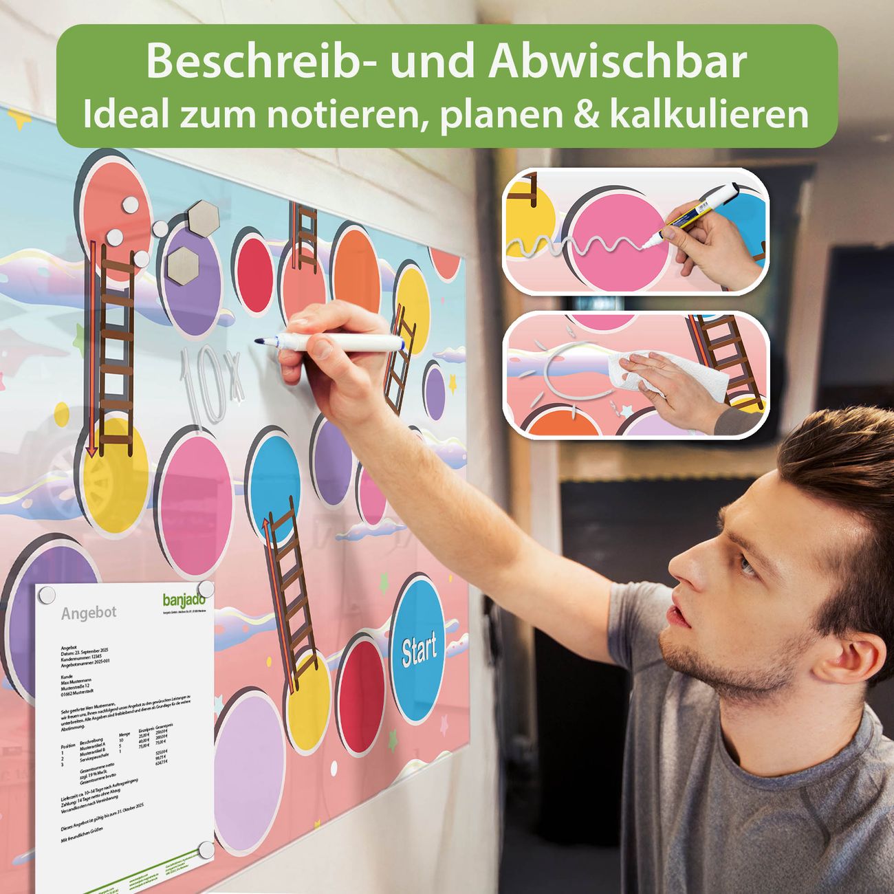 Auf der glatten Glasoberfläche lassen sich Termine, Rezepte oder Notizen ganz einfach mit Kreidestiften festhalten und rückstandslos entfernen. Starke Neodym-Magnete halten Ihre wichtigsten Erinnerungen sicher an Ort und Stelle. So entsteht Ihre ganz persönliche Ideenwand - jeden Tag neu.