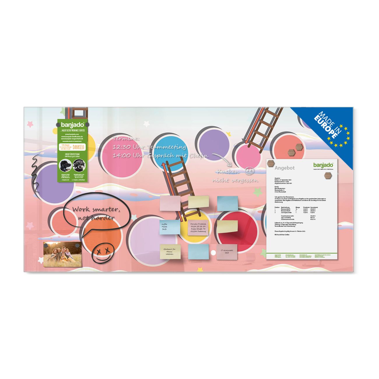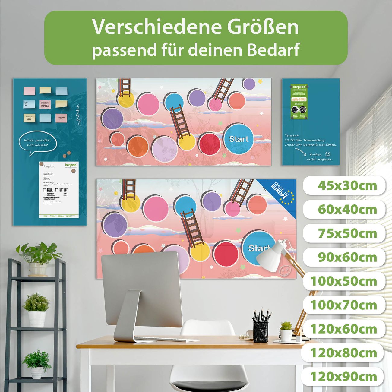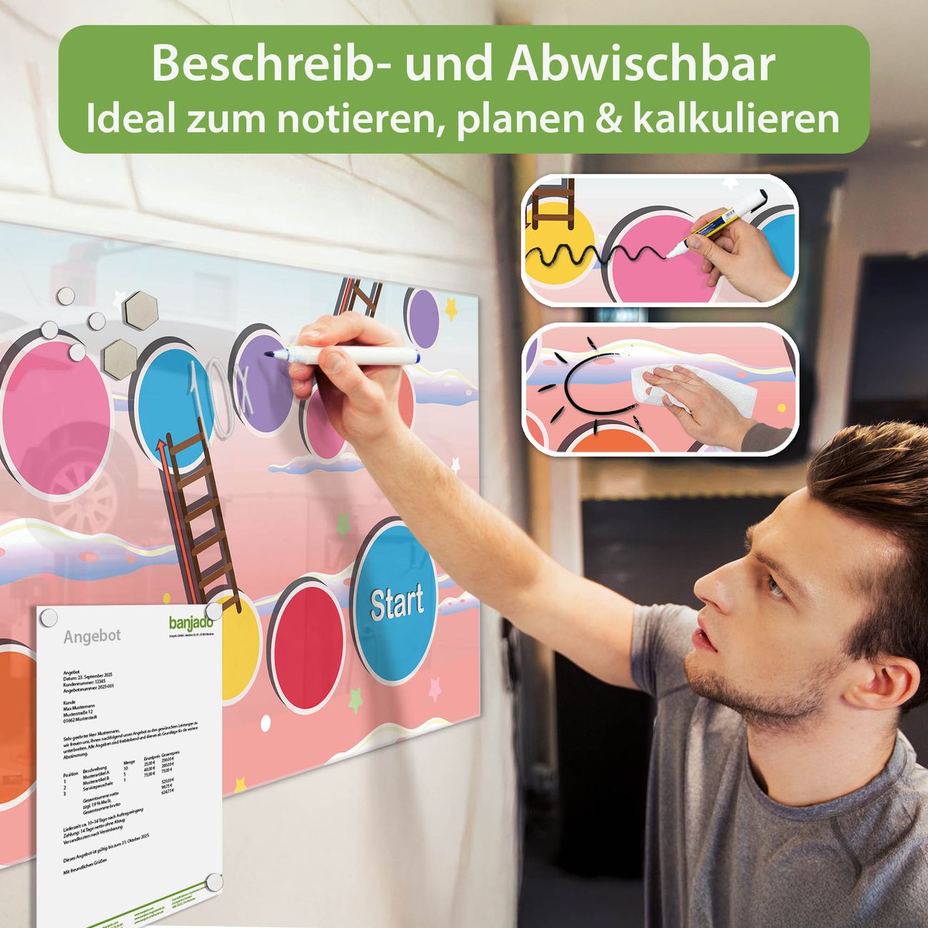 Jede Glas Magnettafel wird in unserer Werkstatt von Hand gefertigt und sorgfältig geprüft. So erhalten Sie ein echtes Qualitätsprodukt, das Funktion und Ästhetik perfekt vereint.?? Warum banjado?