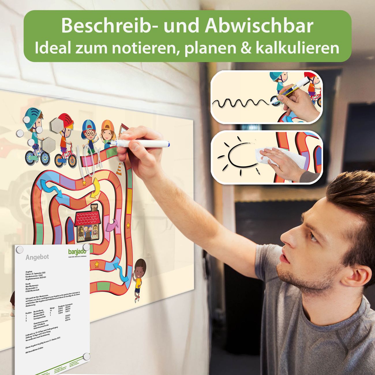 Material: 4mm Sicherheitsglas mit Metallrückwand Eigenschaften: beschreibbar, magnetisch, kratzfest Maße: 100x50x0,6cm, 7,50kg schwer Motiv Nummer 13004 Spielbrett 2 Zubehör: inklusive 4 Neodym-Magnete