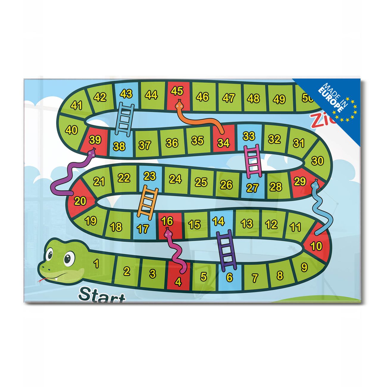 Material: 4mm Sicherheitsglas mit Metallrückwand Eigenschaften: beschreibbar, magnetisch, kratzfest Maße: 75x50x0,6cm, 5,63kg schwer Motiv Nummer 13005 Spielbrett 3 Zubehör: inklusive 4 Neodym-Magnete