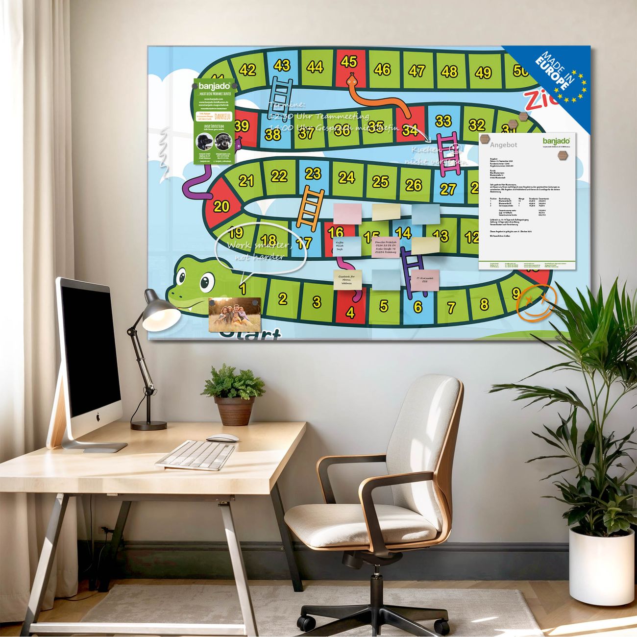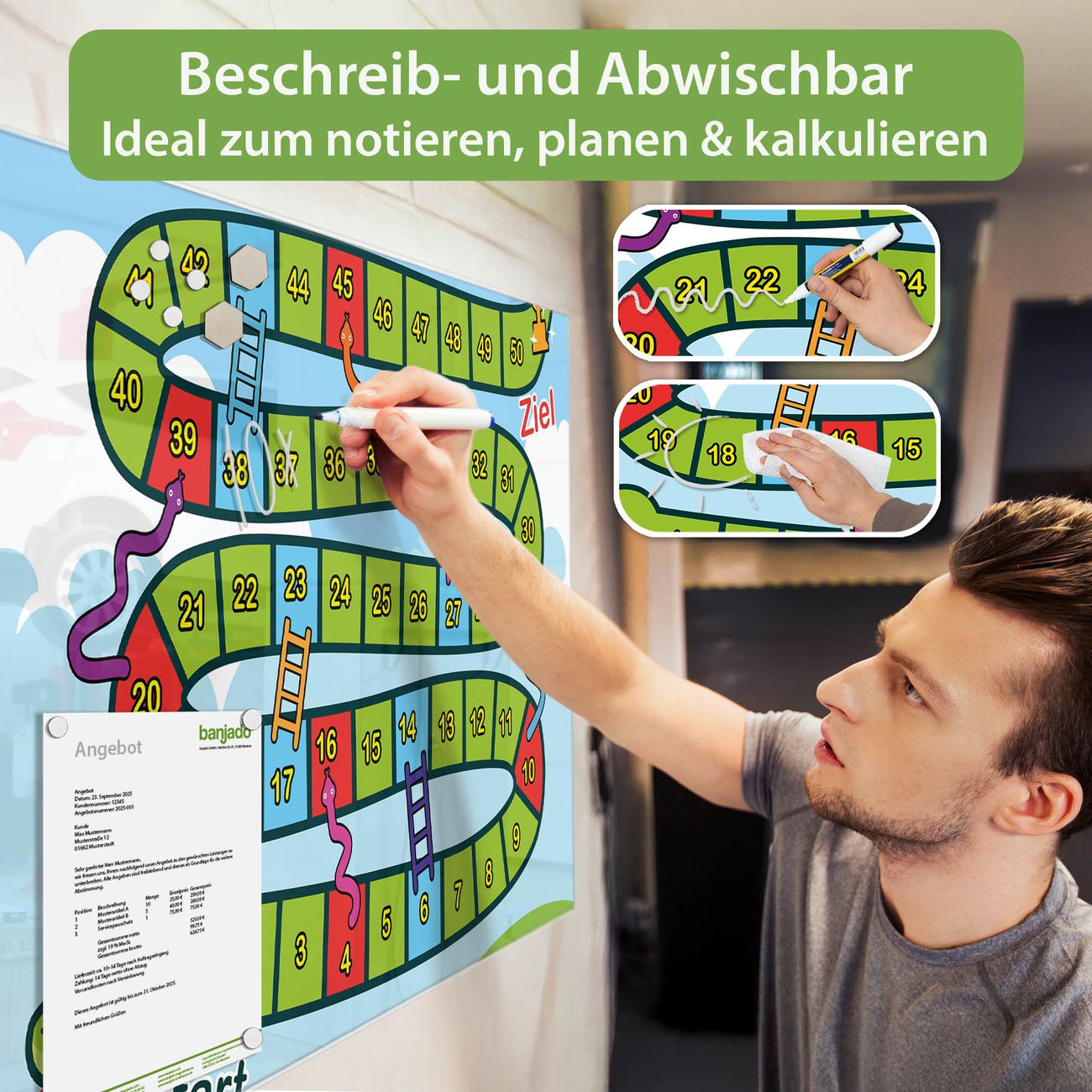 Jede Glas Magnettafel wird in unserer Werkstatt von Hand gefertigt und sorgfältig geprüft. So erhalten Sie ein echtes Qualitätsprodukt, das Funktion und Ästhetik perfekt vereint.?? Warum banjado?