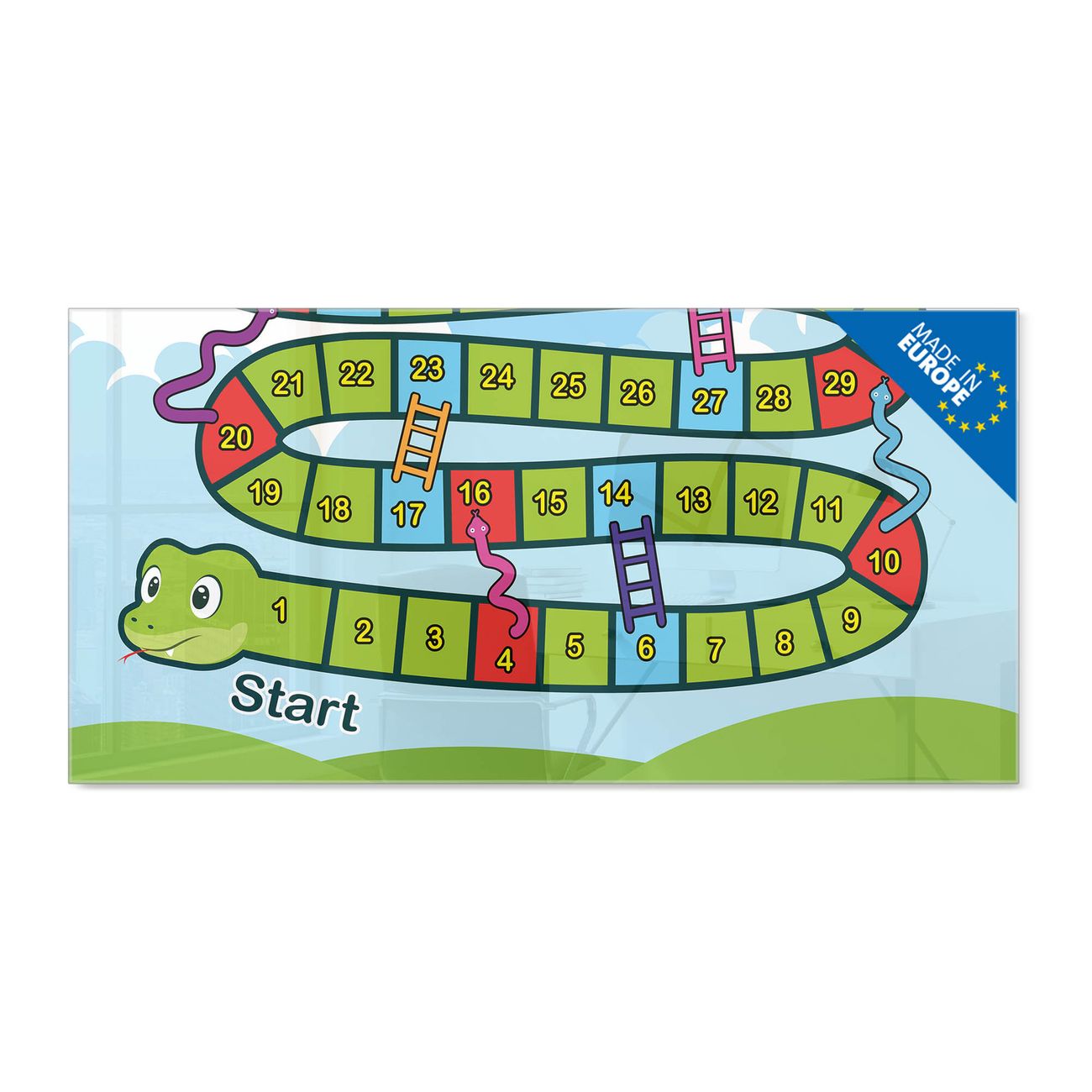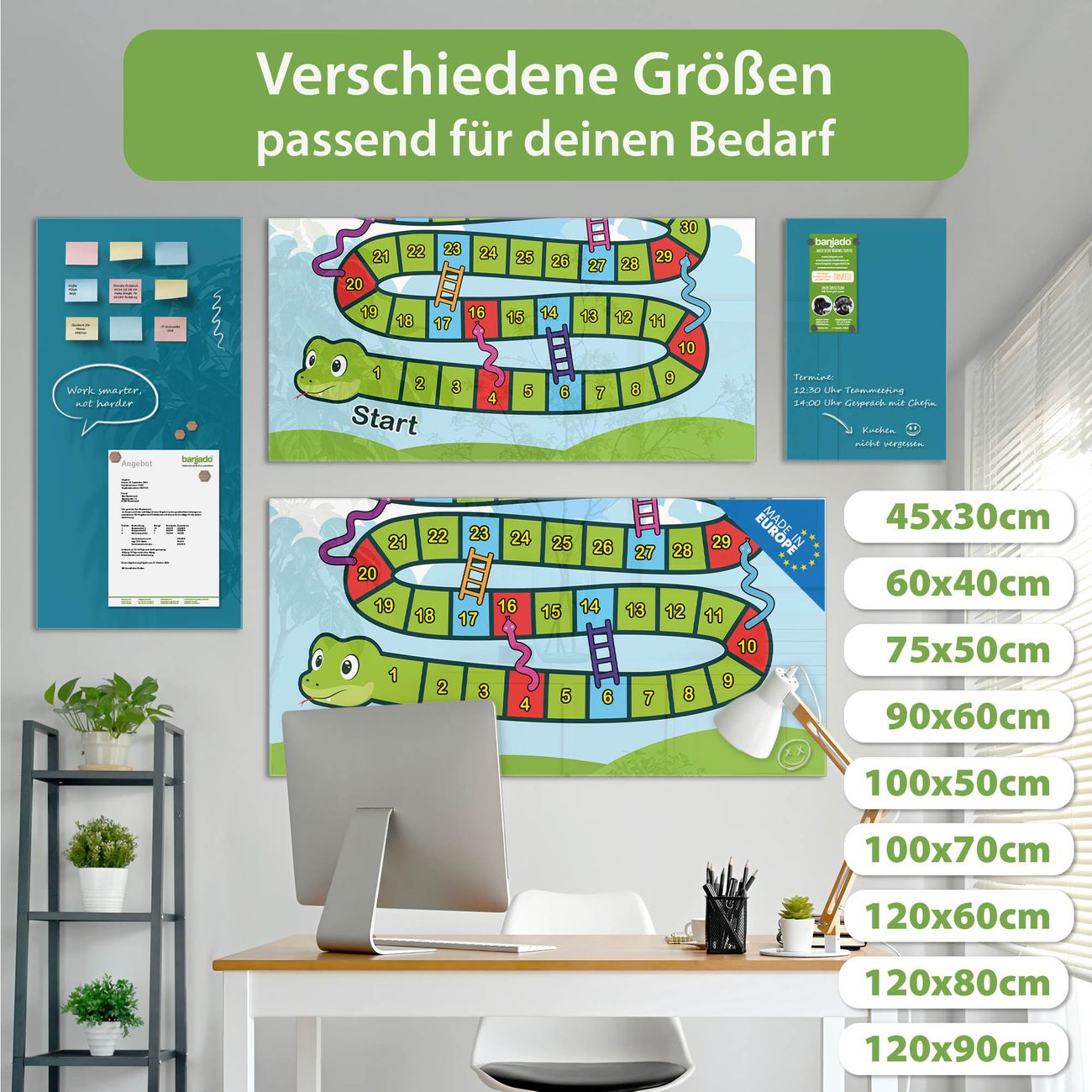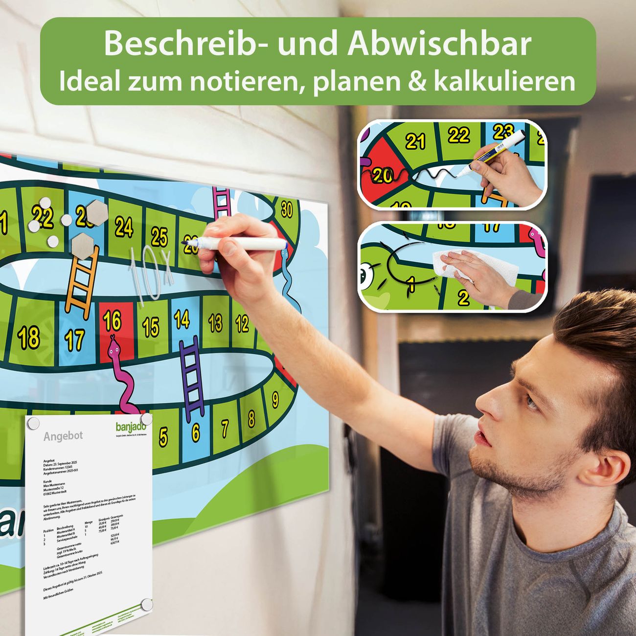 Material: 4mm Sicherheitsglas mit Metallrückwand Eigenschaften: beschreibbar, magnetisch, kratzfest Maße: 100x50x0,6cm, 7,50kg schwer Motiv Nummer 13005 Spielbrett 3 Zubehör: inklusive 4 Neodym-Magnete
