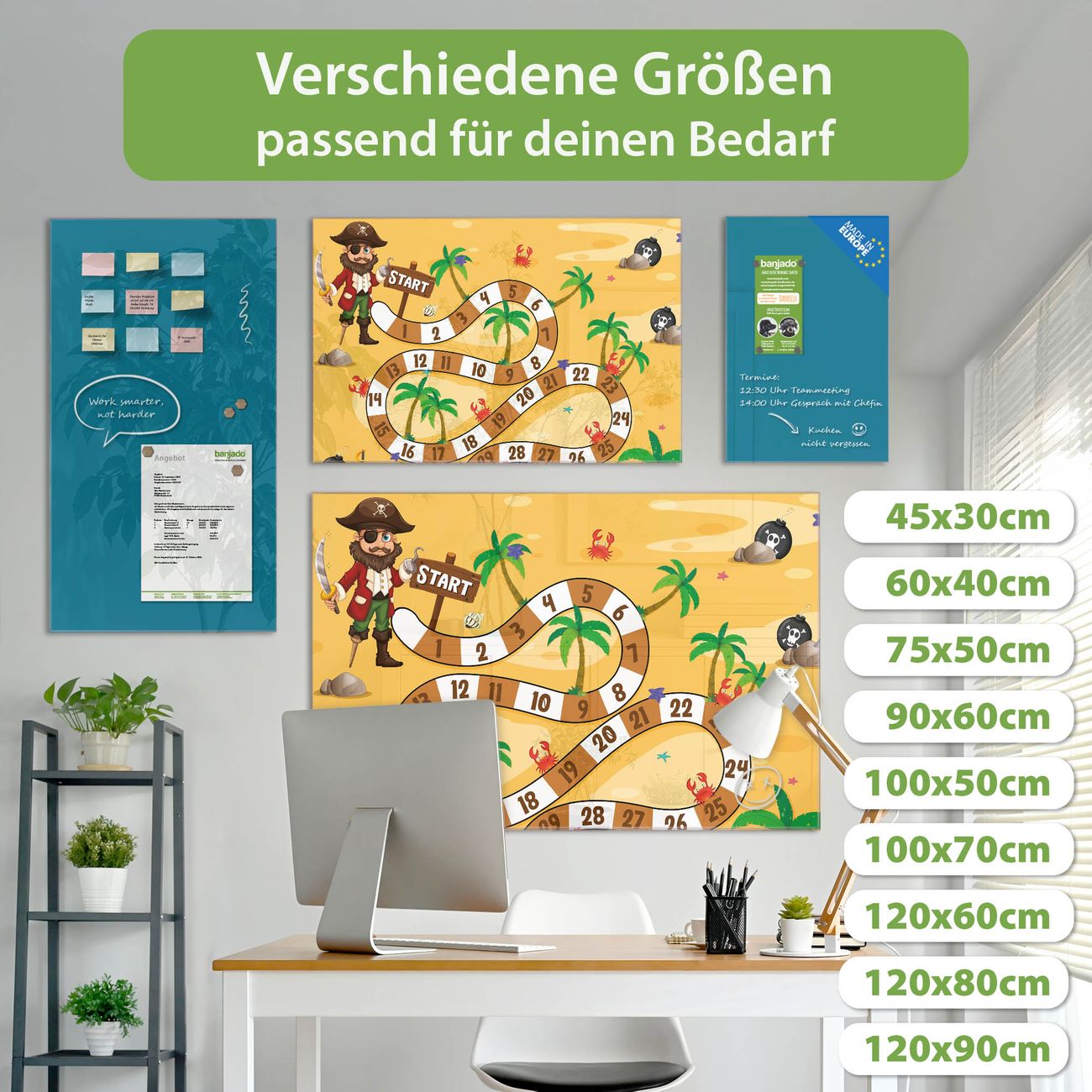 Material: 4mm Sicherheitsglas mit Metallrückwand Eigenschaften: beschreibbar, magnetisch, kratzfest Maße: 90x60x0,6cm, 8,10kg schwer Motiv Nummer 13006 Spielbrett 4 Zubehör: inklusive 4 Neodym-Magnete