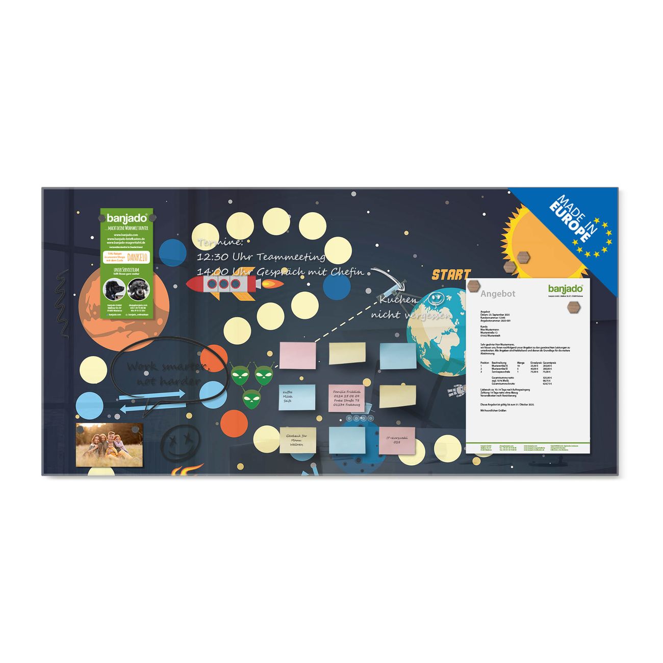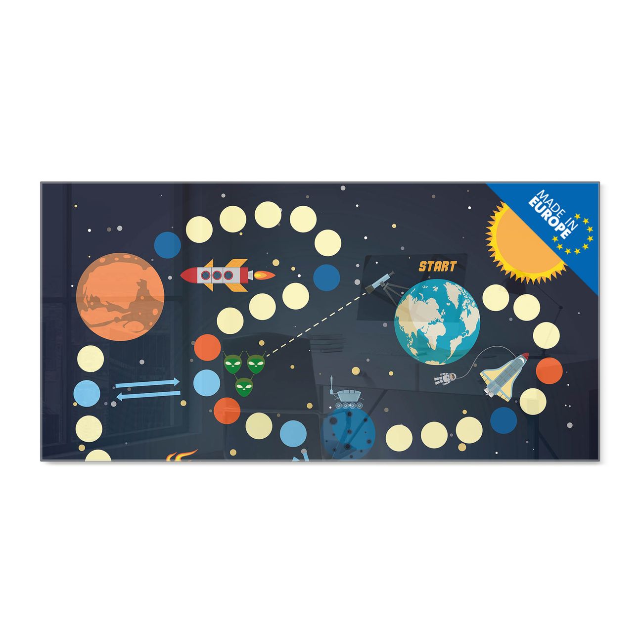 Material: 4mm Sicherheitsglas mit Metallrückwand Eigenschaften: beschreibbar, magnetisch, kratzfest Maße: 100x50x0,6cm, 7,50kg schwer Motiv Nummer 13007 Spielbrett 5 Zubehör: inklusive 4 Neodym-Magnete