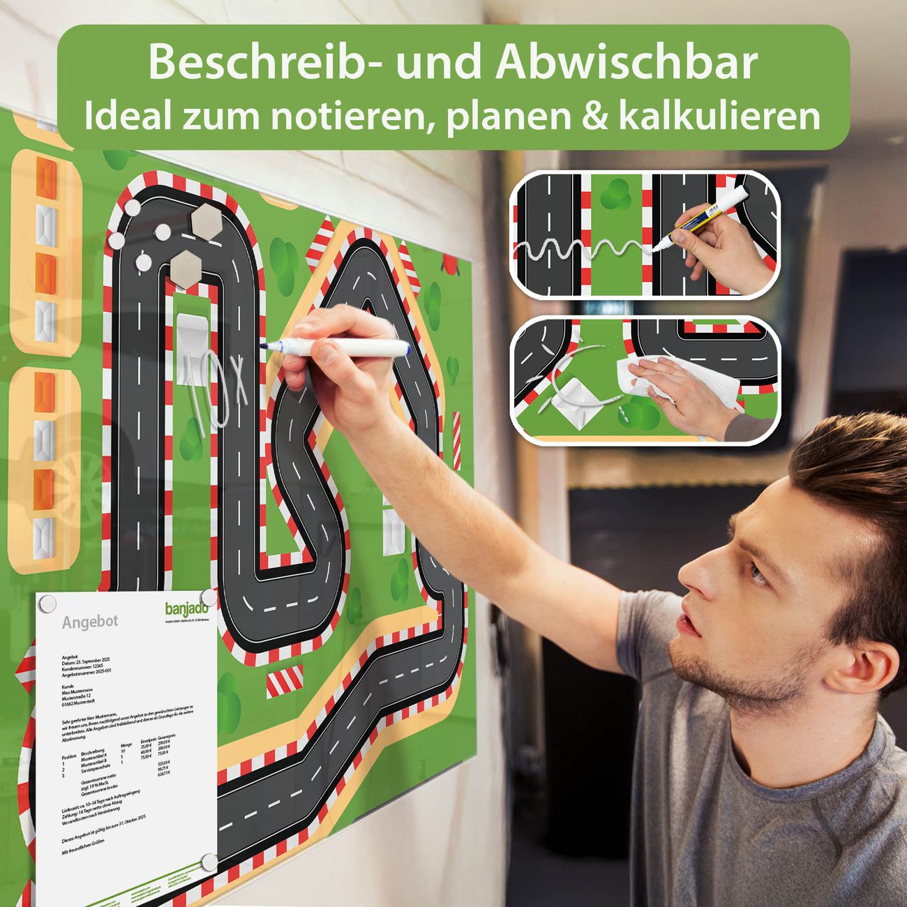 Material: 4mm Sicherheitsglas mit Metallrückwand Eigenschaften: beschreibbar, magnetisch, kratzfest Maße: 90x60x0,6cm, 8,10kg schwer Motiv Nummer 13010 Spielstraße 1 Zubehör: inklusive 4 Neodym-Magnete