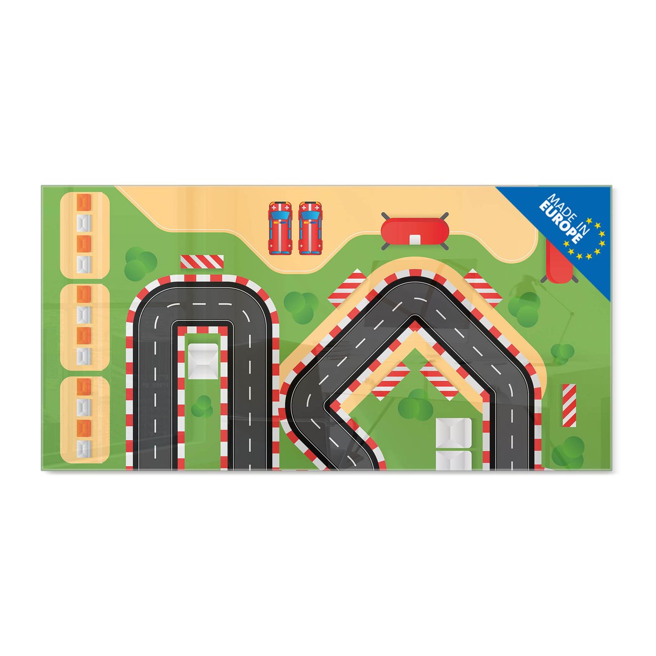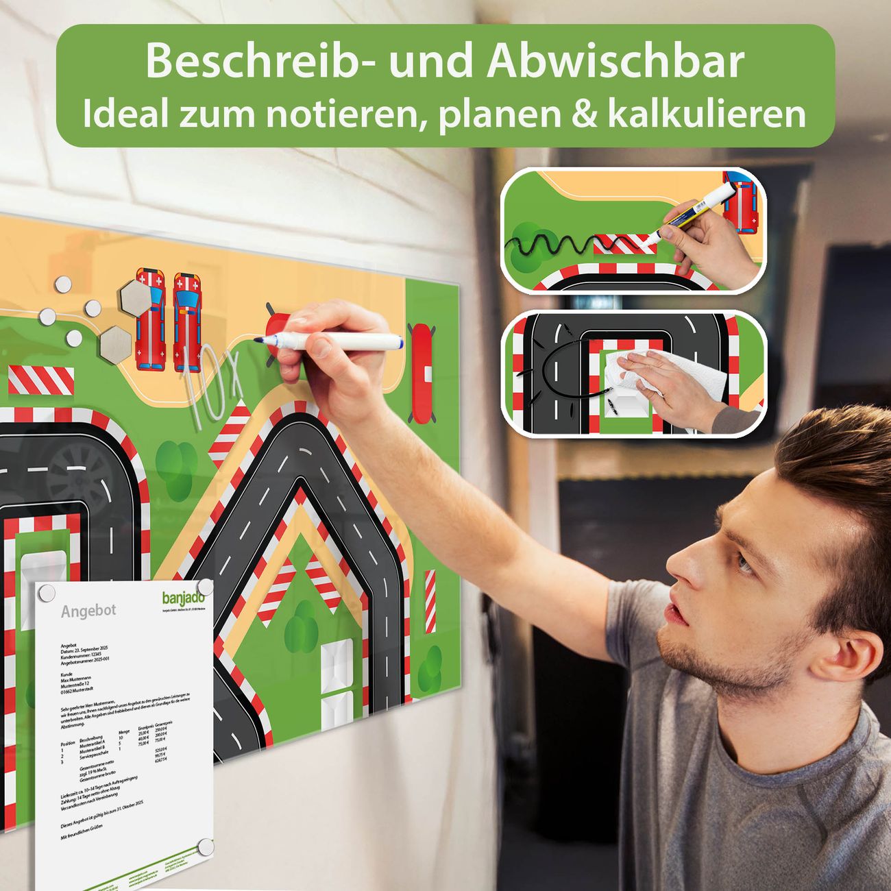 Material: 4mm Sicherheitsglas mit Metallrückwand Eigenschaften: beschreibbar, magnetisch, kratzfest Maße: 100x50x0,6cm, 7,50kg schwer Motiv Nummer 13010 Spielstraße 1 Zubehör: inklusive 4 Neodym-Magnete