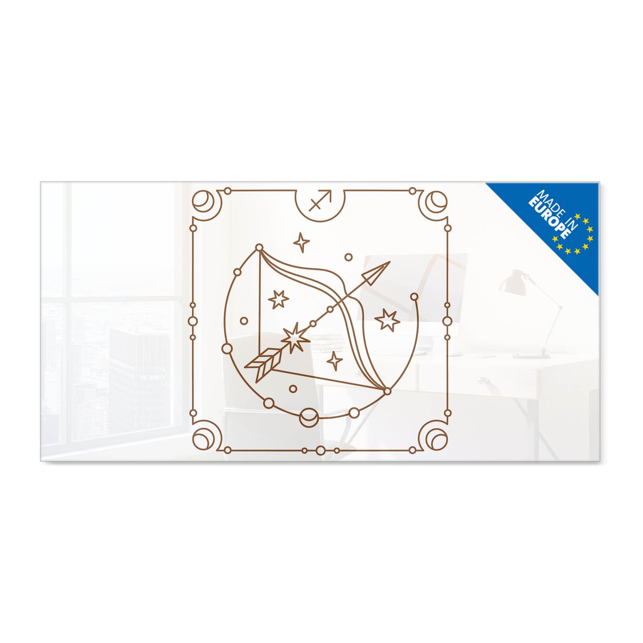 Material: 4mm Sicherheitsglas mit Metallrückwand Eigenschaften: beschreibbar, magnetisch, kratzfest Maße: 100x50x0,6cm, 7,50kg schwer Motiv Nummer 13192 Sternzeichen Schütze Zubehör: inklusive 4 Neodym-Magnete