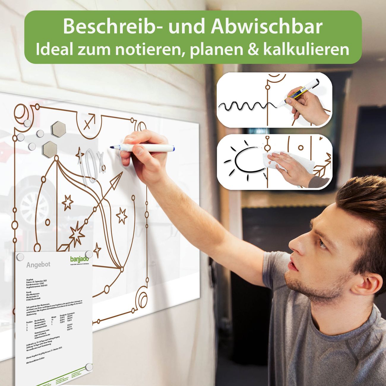 Jede Glas Magnettafel wird in unserer Werkstatt von Hand gefertigt und sorgfältig geprüft. So erhalten Sie ein echtes Qualitätsprodukt, das Funktion und Ästhetik perfekt vereint.?? Warum banjado?