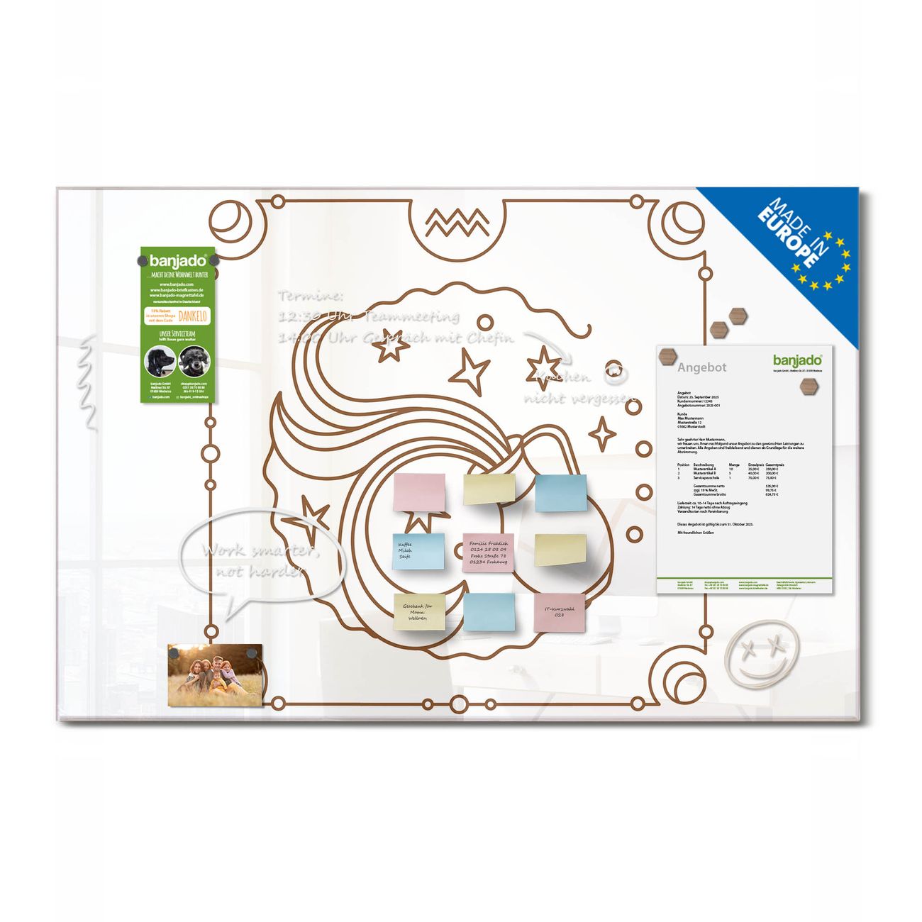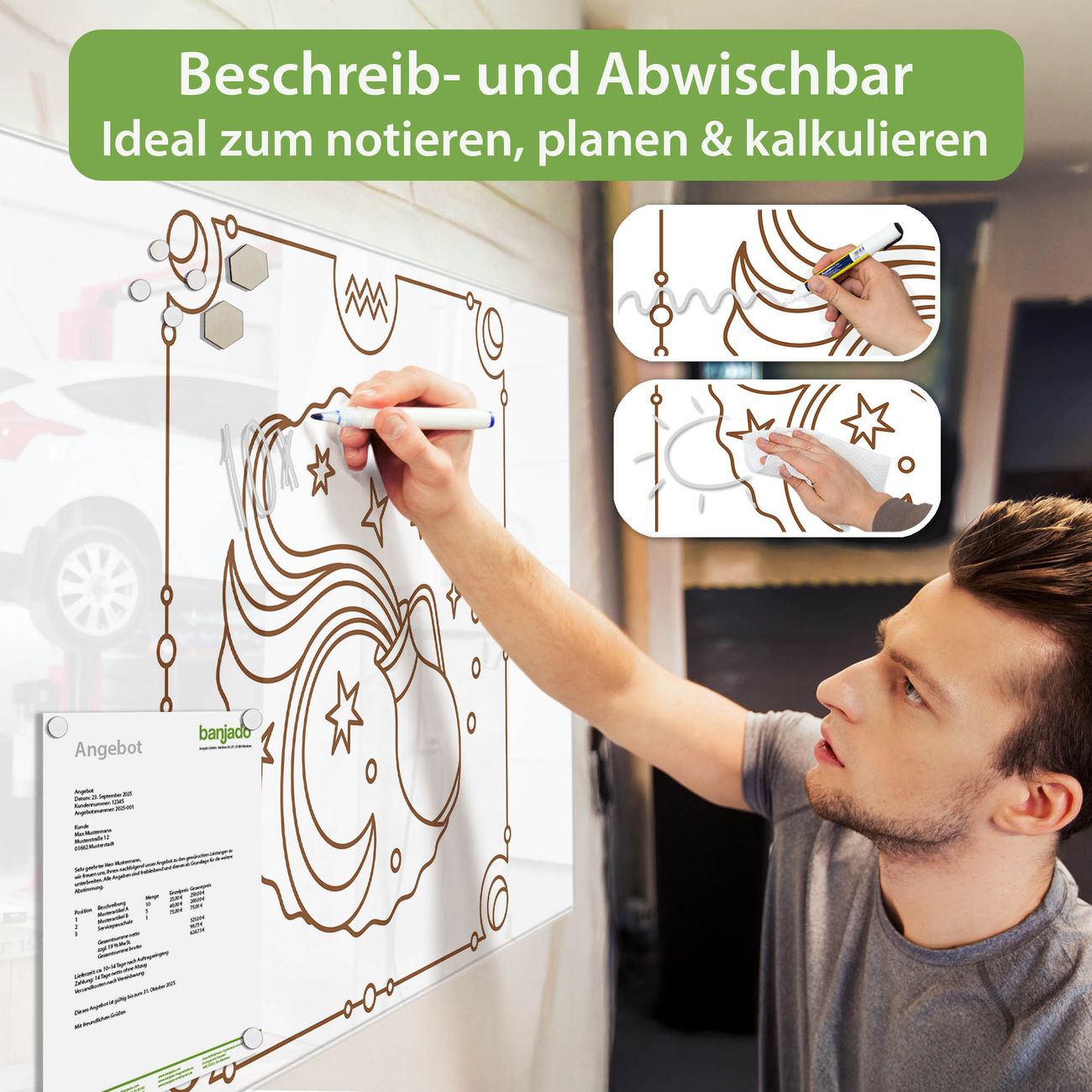 Jede Glas Magnettafel wird in unserer Werkstatt von Hand gefertigt und sorgfältig geprüft. So erhalten Sie ein echtes Qualitätsprodukt, das Funktion und Ästhetik perfekt vereint.?? Warum banjado?