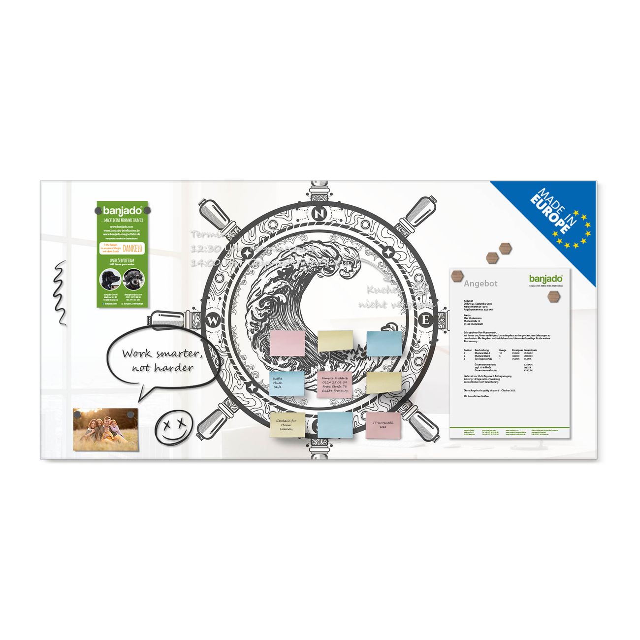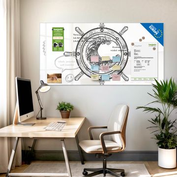 Material: 4mm Sicherheitsglas mit Metallrückwand Eigenschaften: beschreibbar, magnetisch, kratzfest Maße: 100x50x0,6cm, 7,50kg schwer Motiv Nummer 13058 Steuerrad 2 Zubehör: inklusive 4 Neodym-Magnete