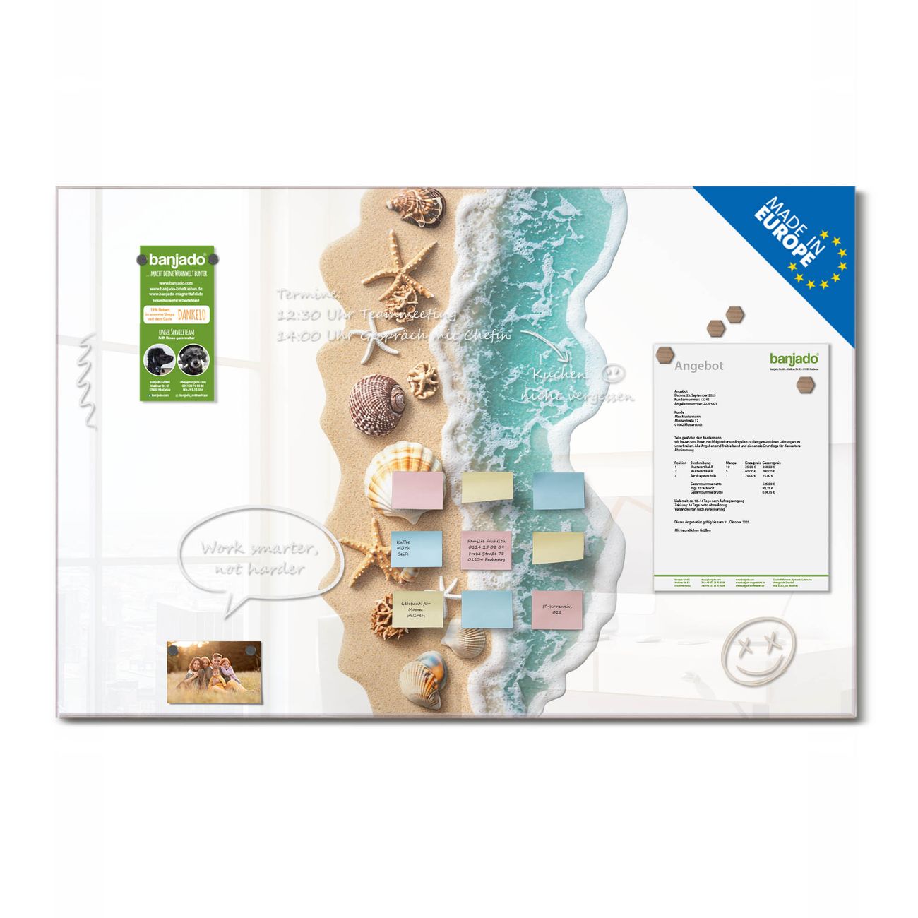Jede Glas Magnettafel wird in unserer Werkstatt von Hand gefertigt und sorgfältig geprüft. So erhalten Sie ein echtes Qualitätsprodukt, das Funktion und Ästhetik perfekt vereint.?? Warum banjado?