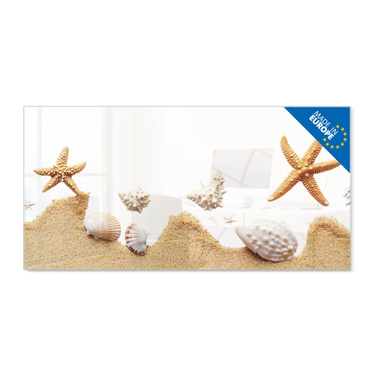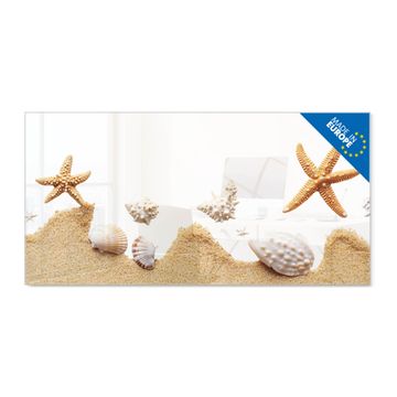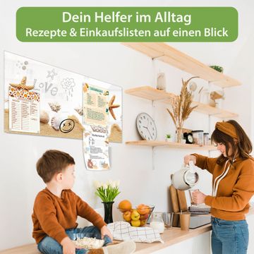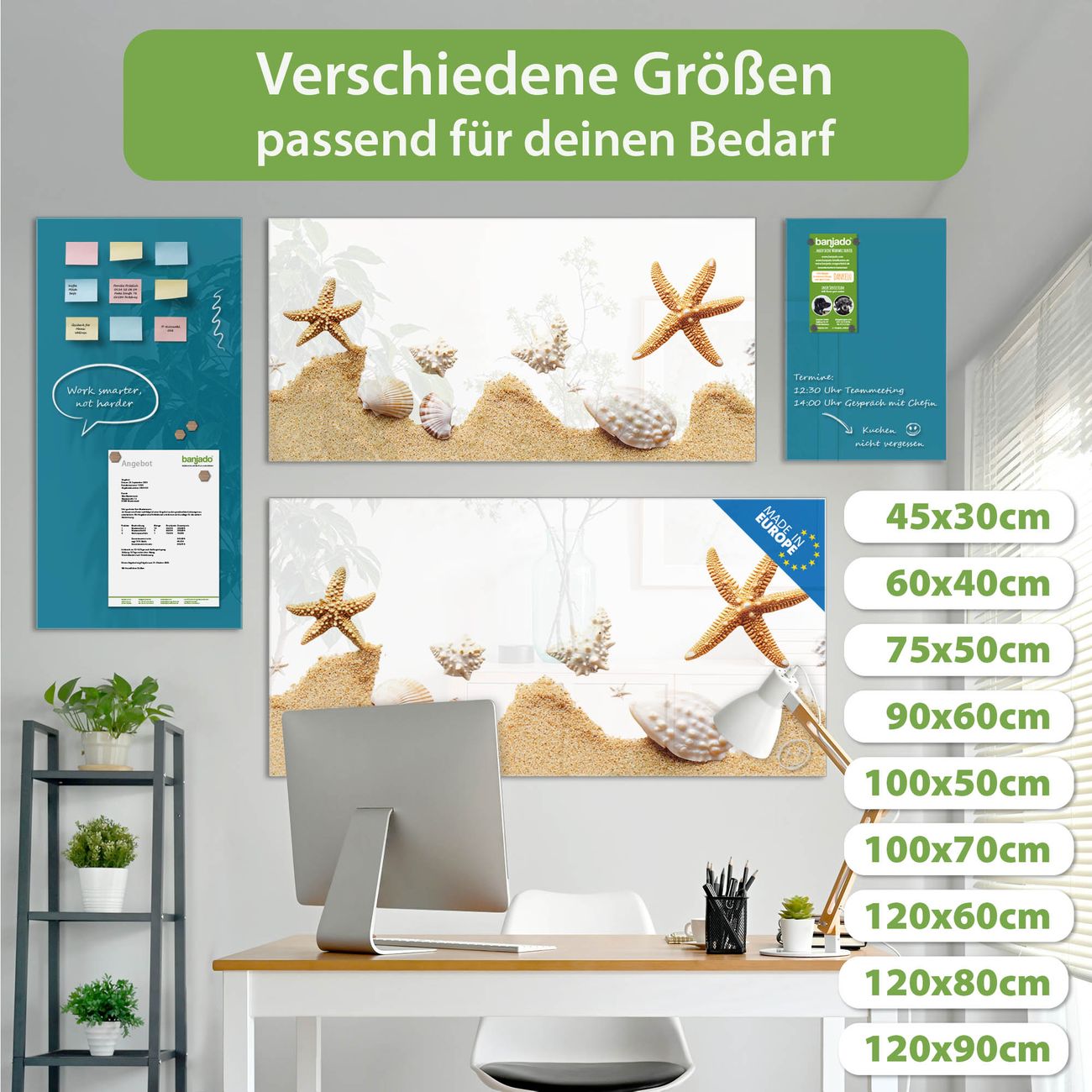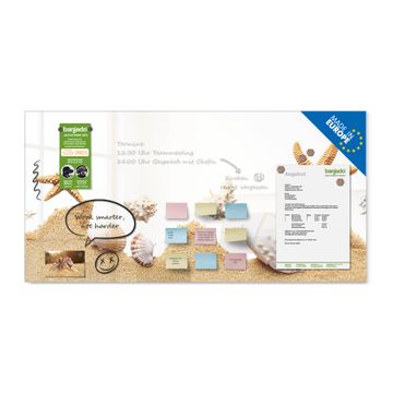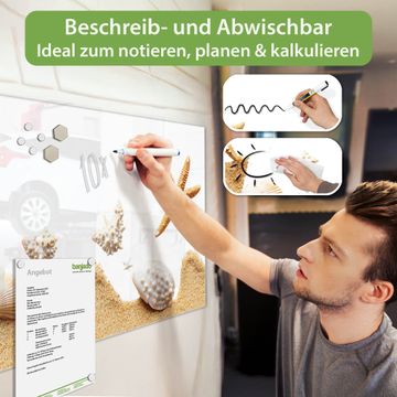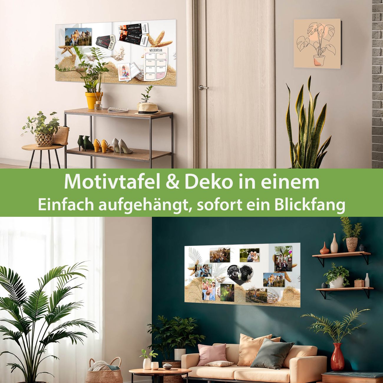 Material: 4mm Sicherheitsglas mit Metallrückwand Eigenschaften: beschreibbar, magnetisch, kratzfest Maße: 120x60x0,6cm, 10,80kg schwer Motiv Nummer 13316 Strandzauber Zubehör: inklusive 4 Neodym-Magnete