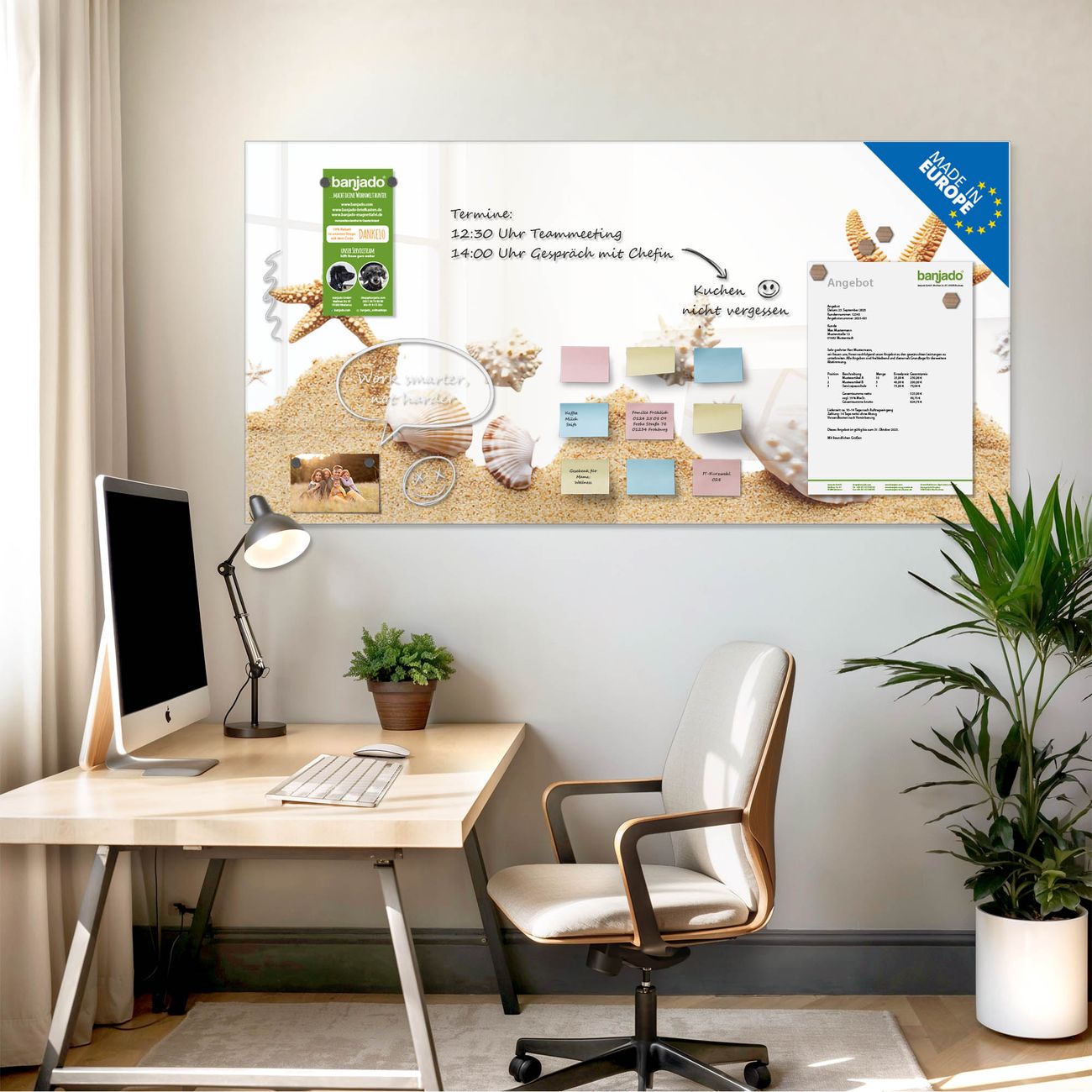 Die banjado Glas Magnettafel mit dem Motiv Motiv Strandzauber verbindet Funktionalität mit Stil. Sie ersetzt das Zettelchaos durch klare Strukturen und bringt dabei eine warme, natürliche Atmosphäre in Ihr Zuhause. Ob im Büro, in der Küche oder im Eingangsbereich - dieses Design-Board zieht Blicke an und sorgt für Ordnung mit Charakter.