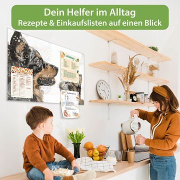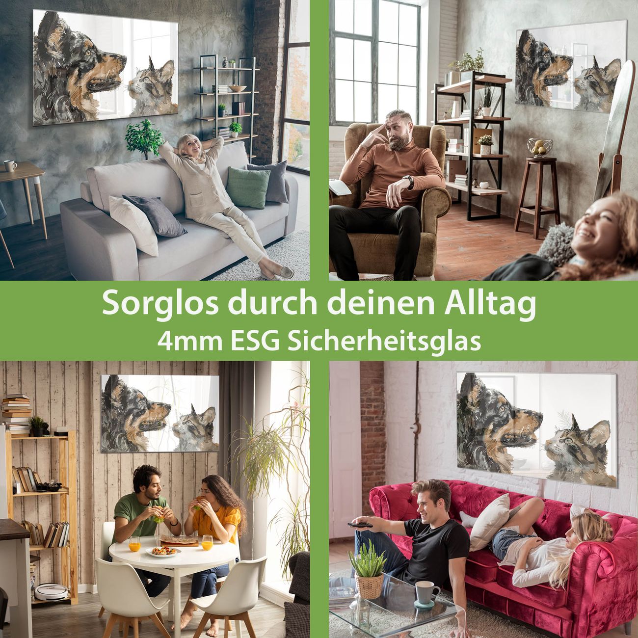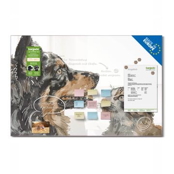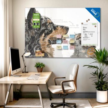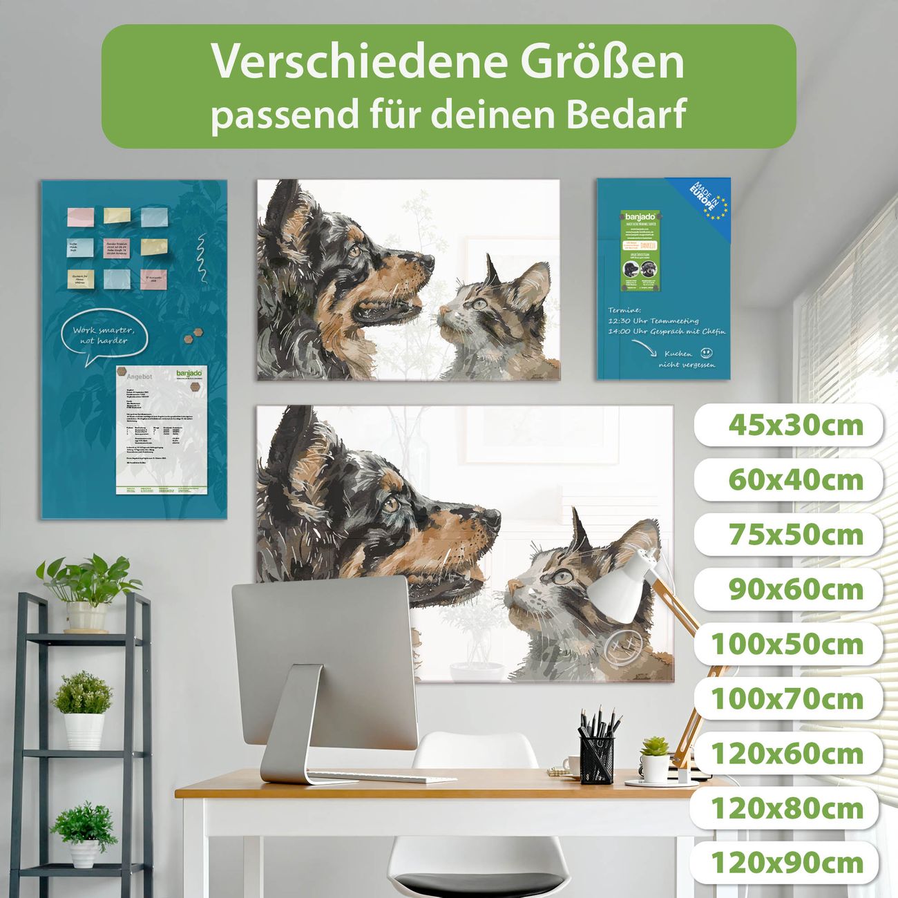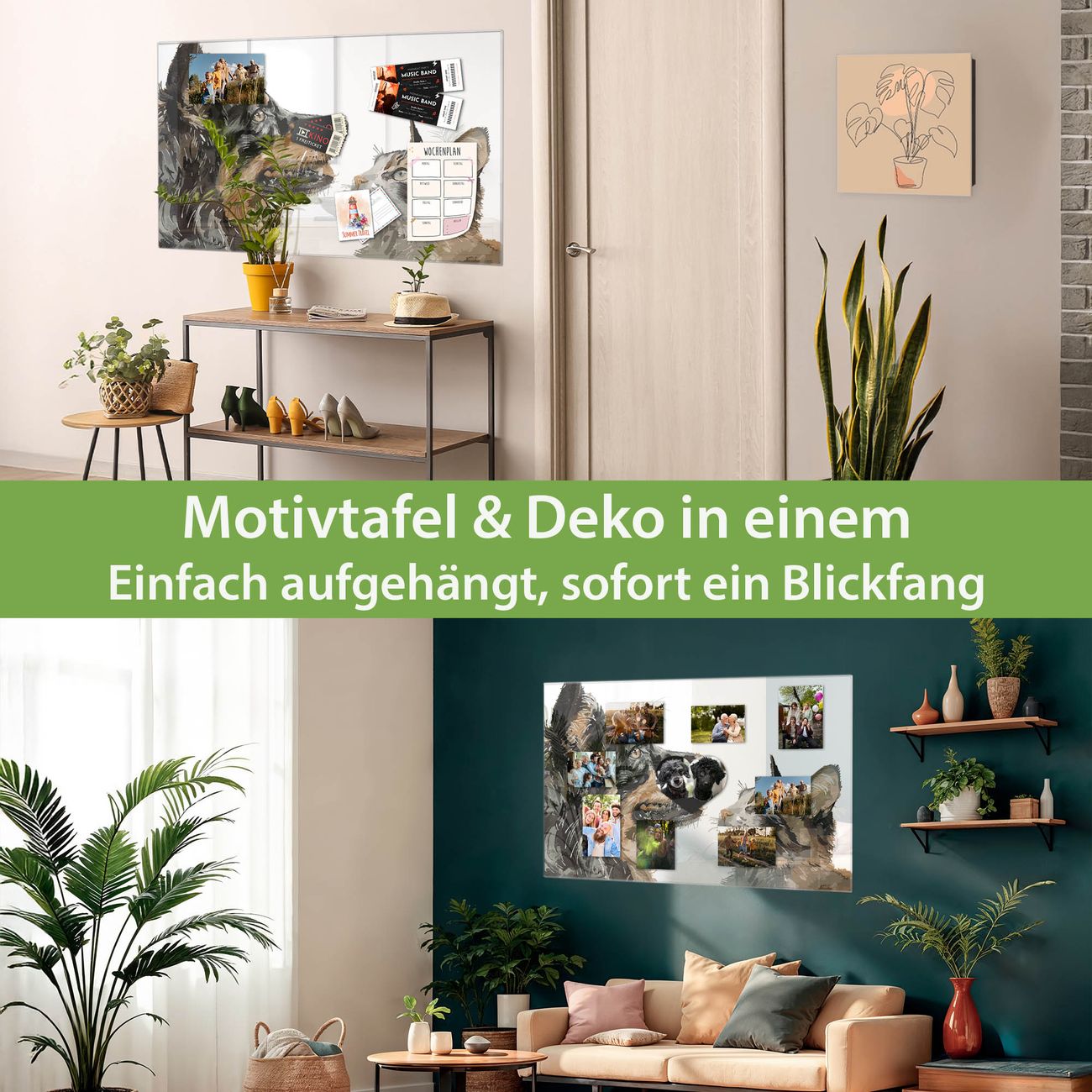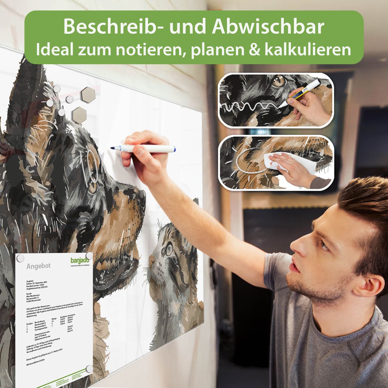 Material: 4mm Sicherheitsglas mit Metallrückwand Eigenschaften: beschreibbar, magnetisch, kratzfest Maße: 120x80x0,6cm, 14,40kg schwer Motiv Nummer 13408 Tierische Begegnung Zubehör: inklusive 4 Neodym-Magnete