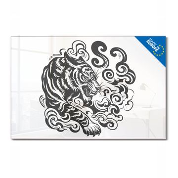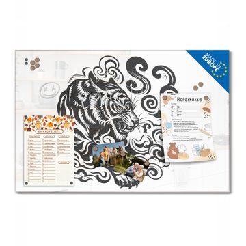 Material: 4mm Sicherheitsglas mit Metallrückwand Eigenschaften: beschreibbar, magnetisch, kratzfest Maße: 100x50x0,6cm, 7,50kg schwer Motiv Nummer 13481 Tiger Illustration Zubehör: inklusive 4 Neodym-Magnete