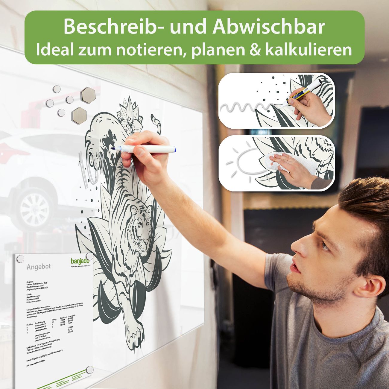 Jede Glas Magnettafel wird in unserer Werkstatt von Hand gefertigt und sorgfältig geprüft. So erhalten Sie ein echtes Qualitätsprodukt, das Funktion und Ästhetik perfekt vereint.?? Warum banjado?