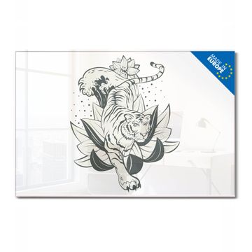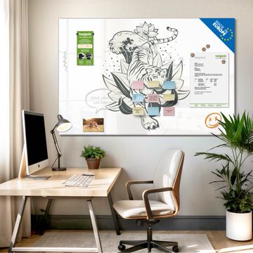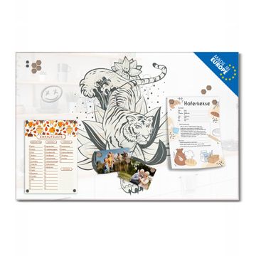 Material: 4mm Sicherheitsglas mit Metallrückwand Eigenschaften: beschreibbar, magnetisch, kratzfest Maße: 75x50x0,6cm, 5,63kg schwer Motiv Nummer 13479 Tiger im Blumenmeer Zubehör: inklusive 4 Neodym-Magnete