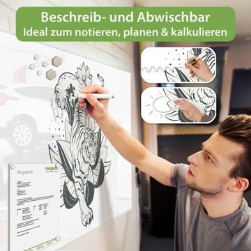 Auf der glatten Glasoberfläche lassen sich Termine, Rezepte oder Notizen ganz einfach mit Kreidestiften festhalten und rückstandslos entfernen. Starke Neodym-Magnete halten Ihre wichtigsten Erinnerungen sicher an Ort und Stelle. So entsteht Ihre ganz persönliche Ideenwand - jeden Tag neu.