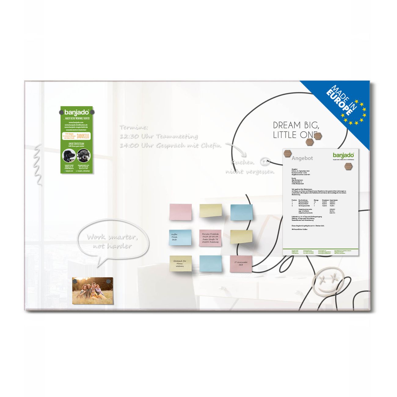 Jede Glas Magnettafel wird in unserer Werkstatt von Hand gefertigt und sorgfältig geprüft. So erhalten Sie ein echtes Qualitätsprodukt, das Funktion und Ästhetik perfekt vereint.?? Warum banjado?