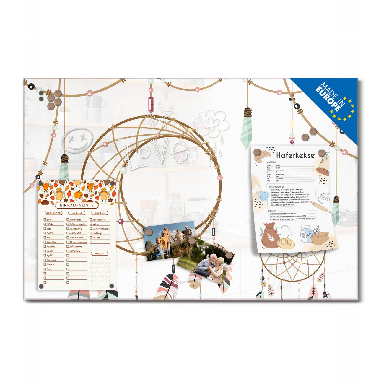 Ein Stück Design, das Ihren Alltag organisiert. Schreiben, heften, inspirieren - alles an einem Ort. Qualität, die man spürt. Montage leicht gemacht. Handwerk mit Herz - veredelt in Sachsen. Einzigartiges Design mit Motiv Motiv Traumfänger Eleganz Beschreibbare Glasoberfläche, leicht zu reinigen Starke Magnetkraft durch Stahlrückwand Inklusive 4 Neodym-Magneten Flexible Montageoptionen Handveredelt in Sachsen - Qualität, die bleibt