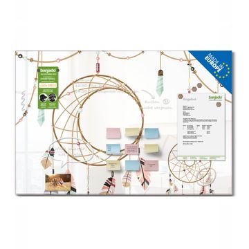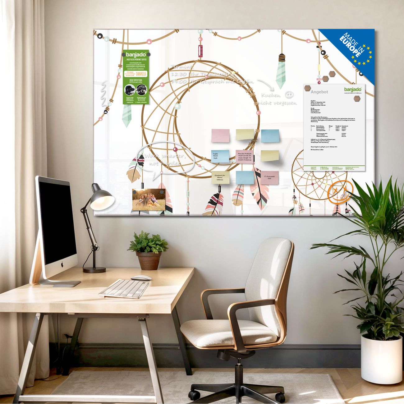 Die banjado Glas Magnettafel mit dem Motiv Motiv Traumfänger Eleganz verbindet Funktionalität mit Stil. Sie ersetzt das Zettelchaos durch klare Strukturen und bringt dabei eine warme, natürliche Atmosphäre in Ihr Zuhause. Ob im Büro, in der Küche oder im Eingangsbereich - dieses Design-Board zieht Blicke an und sorgt für Ordnung mit Charakter.