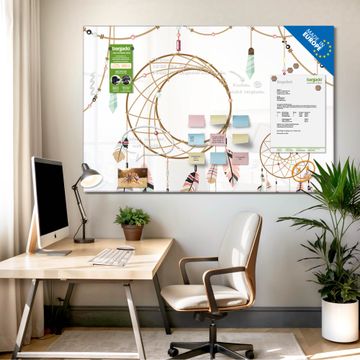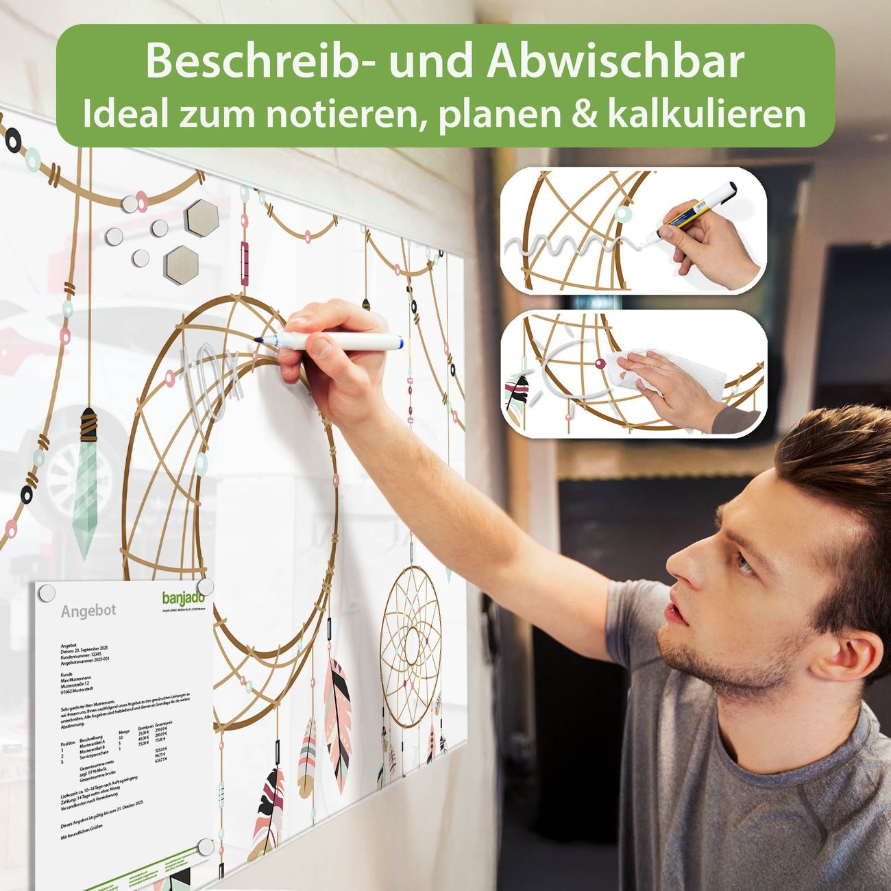 Material: 4mm Sicherheitsglas mit Metallrückwand Eigenschaften: beschreibbar, magnetisch, kratzfest Maße: 90x60x0,6cm, 8,10kg schwer Motiv Nummer 13155 Traumfänger Eleganz Zubehör: inklusive 4 Neodym-Magnete