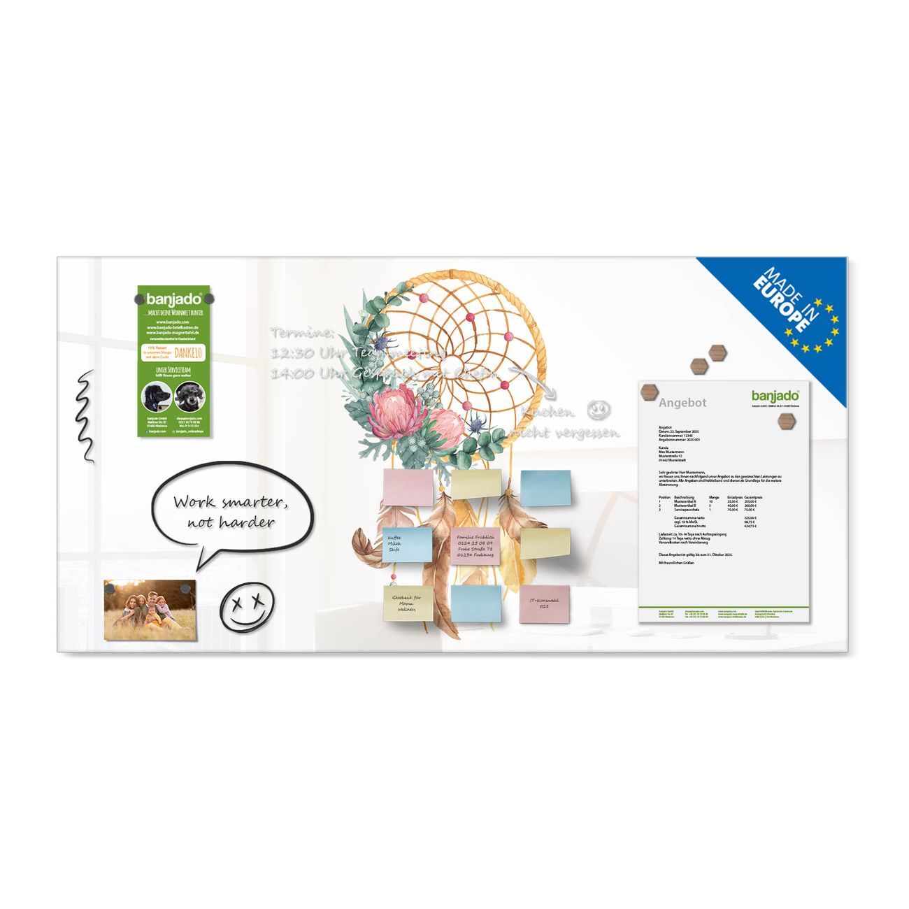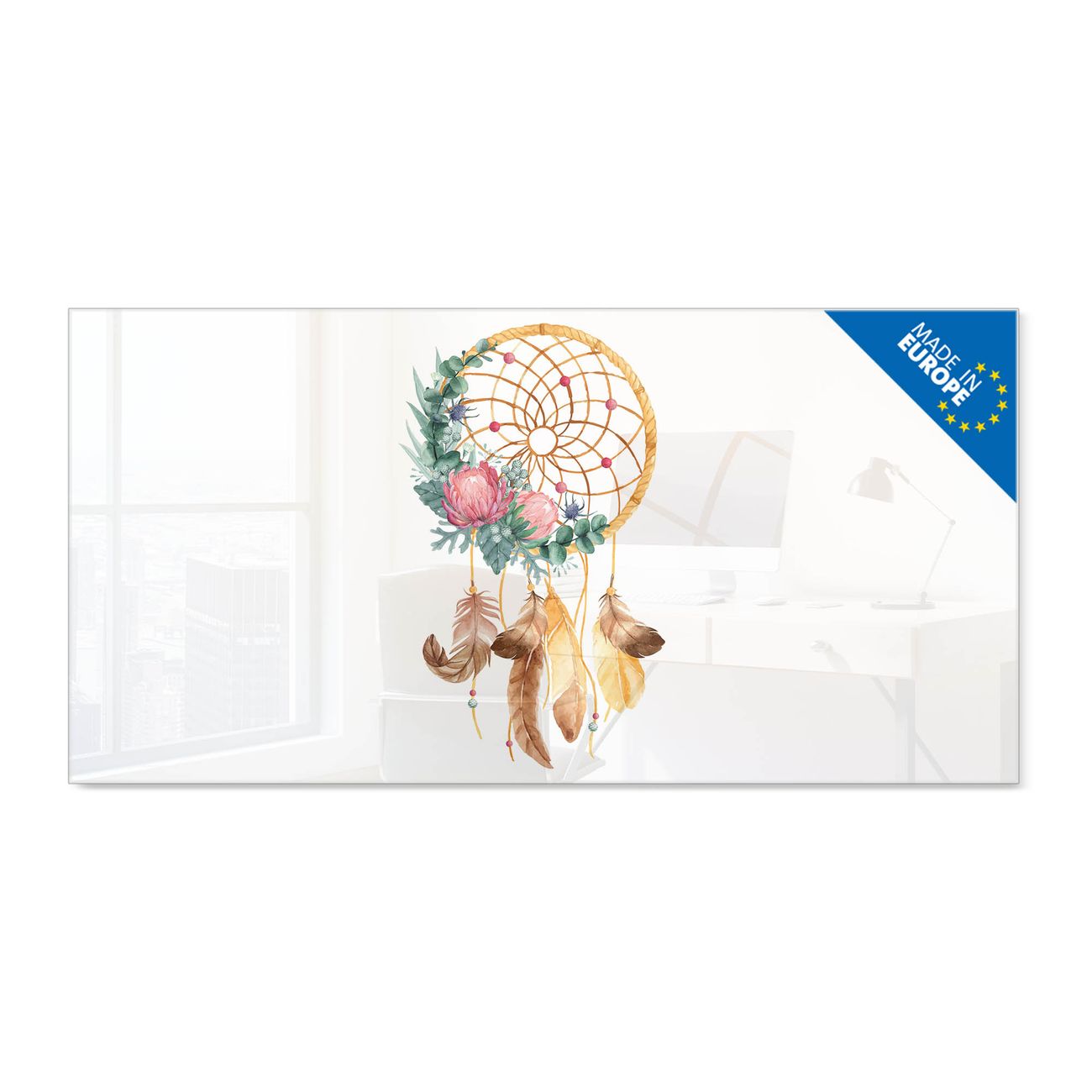 Glas Magnettafel im Querformat Motiv Traumfänger Federn und Blumen
