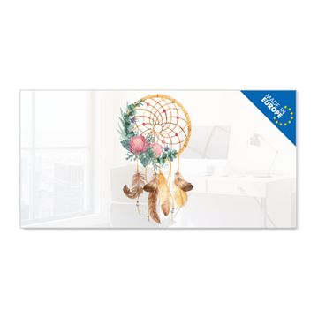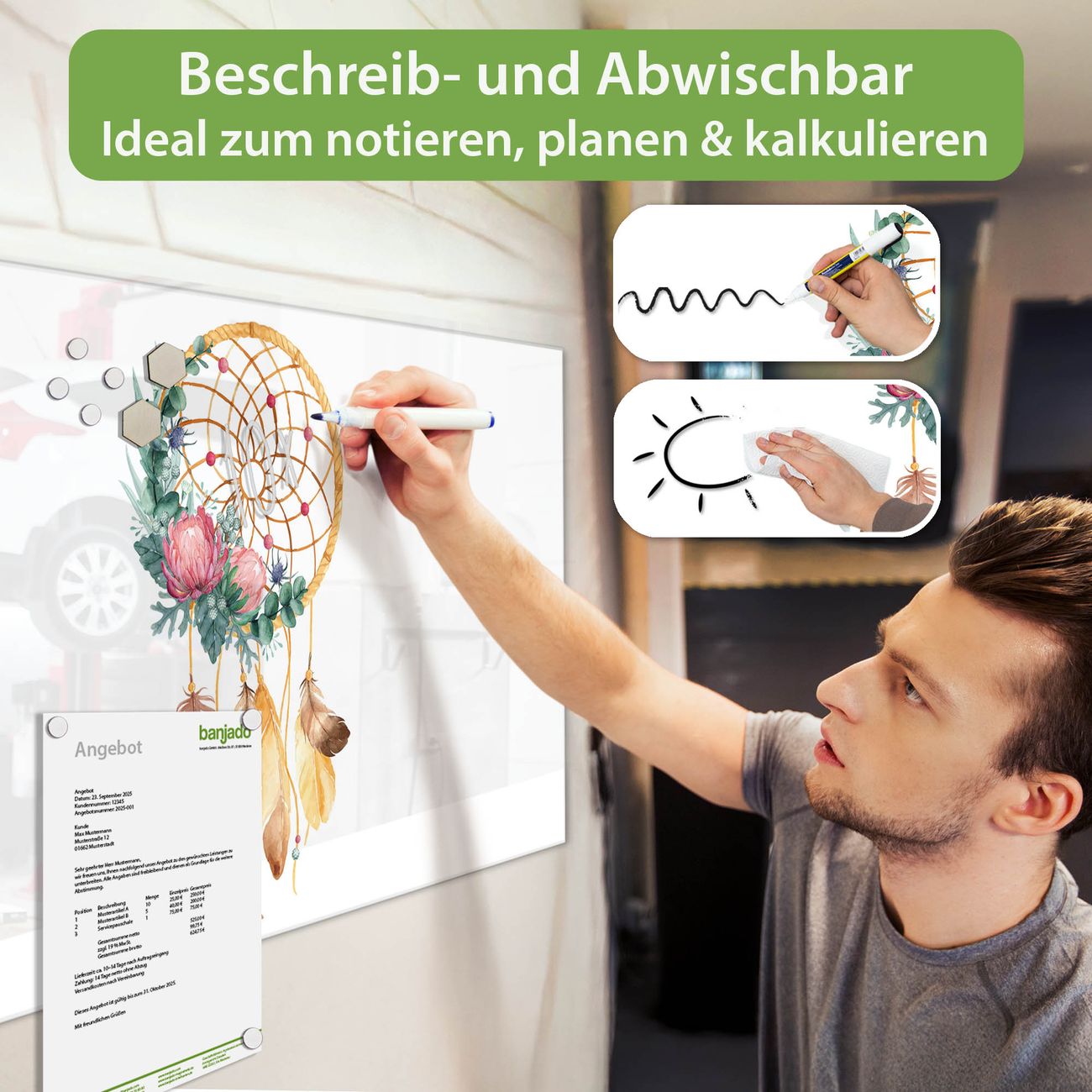 Material: 4mm Sicherheitsglas mit Metallrückwand Eigenschaften: beschreibbar, magnetisch, kratzfest Maße: 100x50x0,6cm, 7,50kg schwer Motiv Nummer 13152 Traumfänger Federn und Blumen Zubehör: inklusive 4 Neodym-Magnete