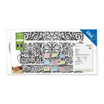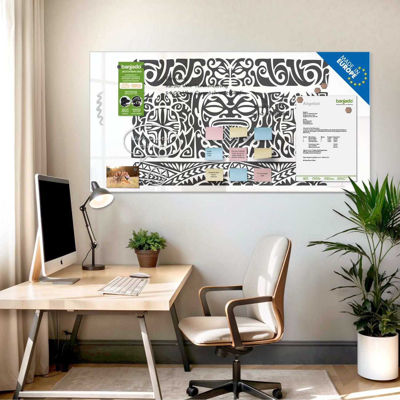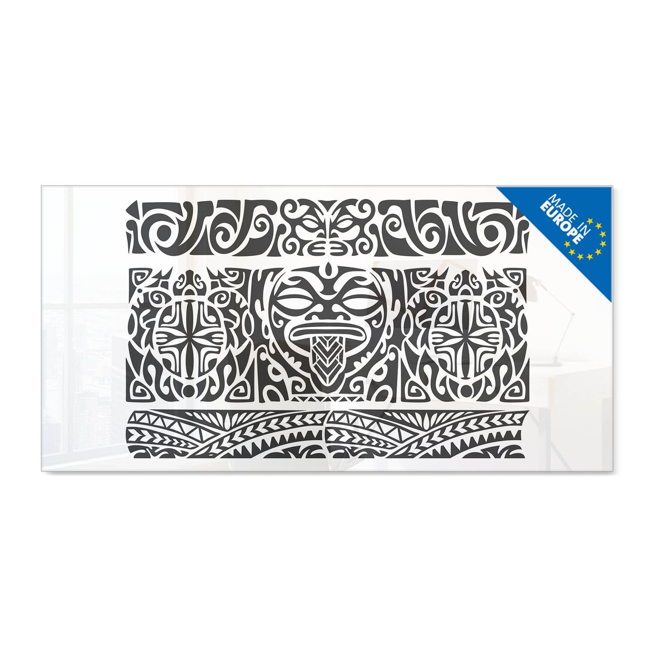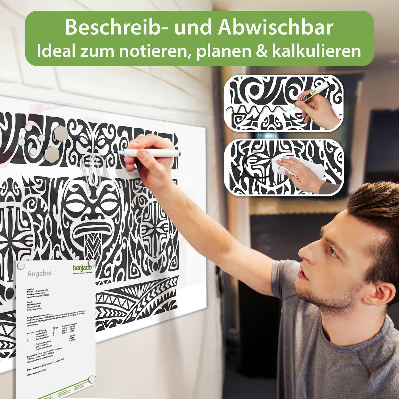 Material: 4mm Sicherheitsglas mit Metallrückwand Eigenschaften: beschreibbar, magnetisch, kratzfest Maße: 100x50x0,6cm, 7,50kg schwer Motiv Nummer 13346 Tribal Muster Zubehör: inklusive 4 Neodym-Magnete