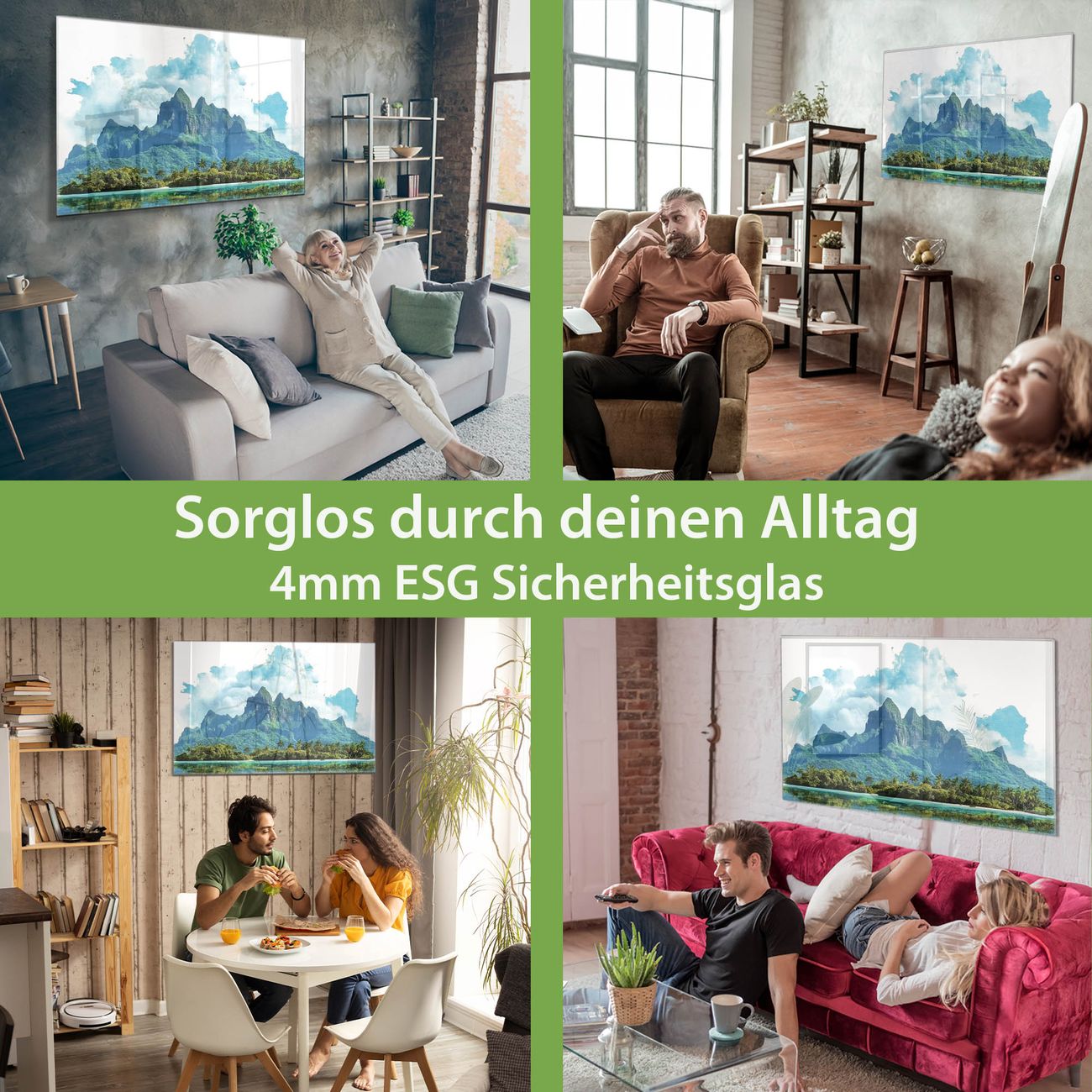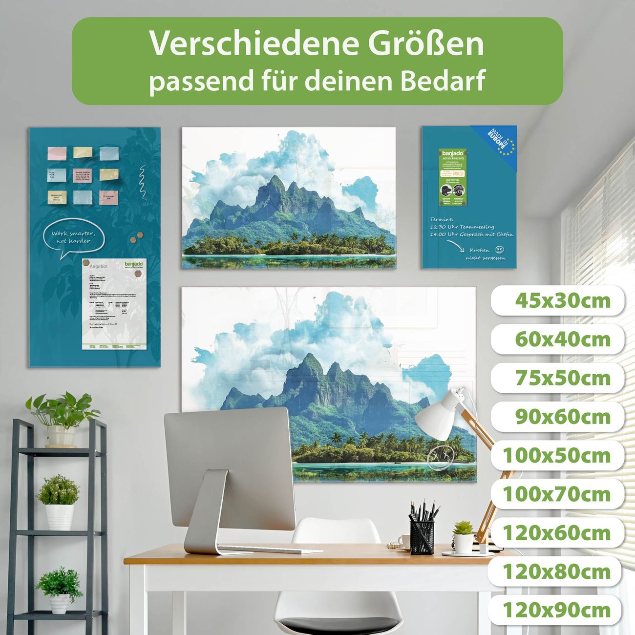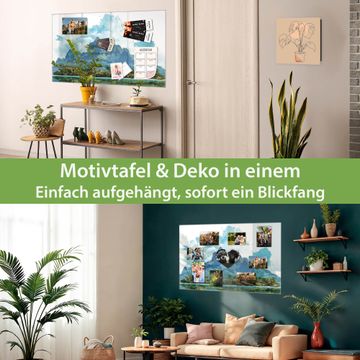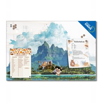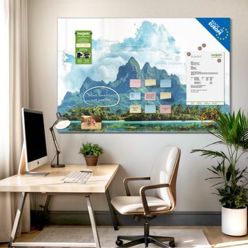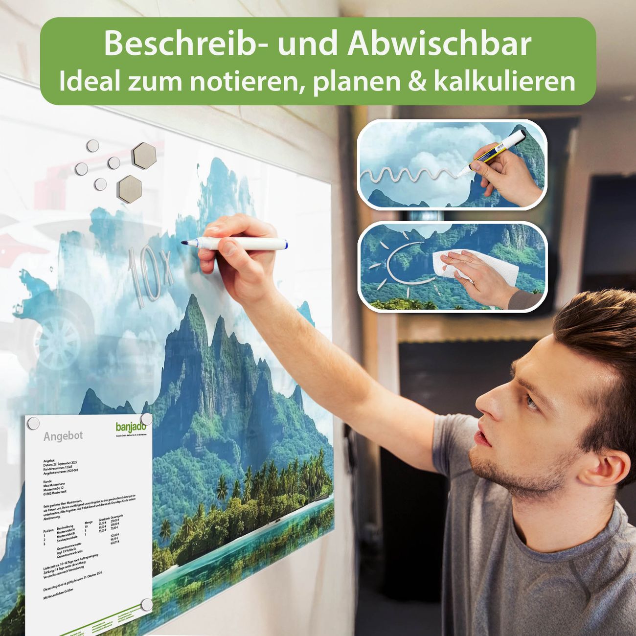 Material: 4mm Sicherheitsglas mit Metallrückwand Eigenschaften: beschreibbar, magnetisch, kratzfest Maße: 90x60x0,6cm, 8,10kg schwer Motiv Nummer 13278 Tropenparadies Zubehör: inklusive 4 Neodym-Magnete