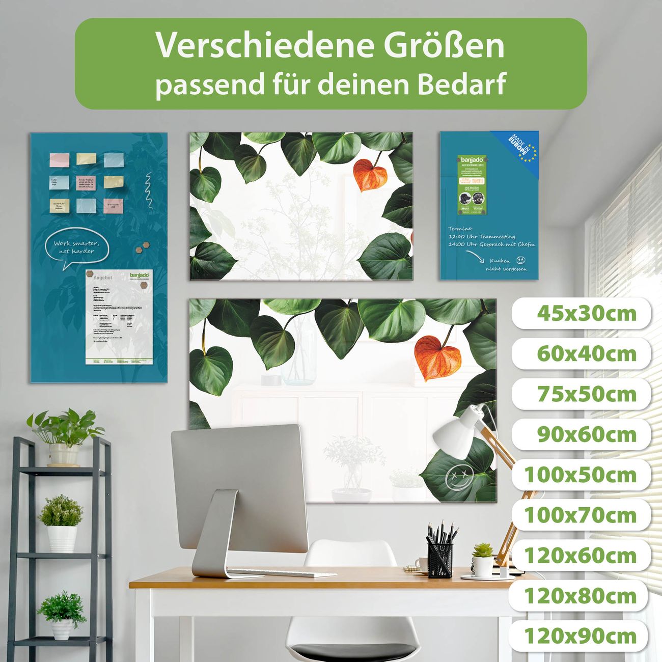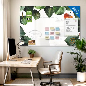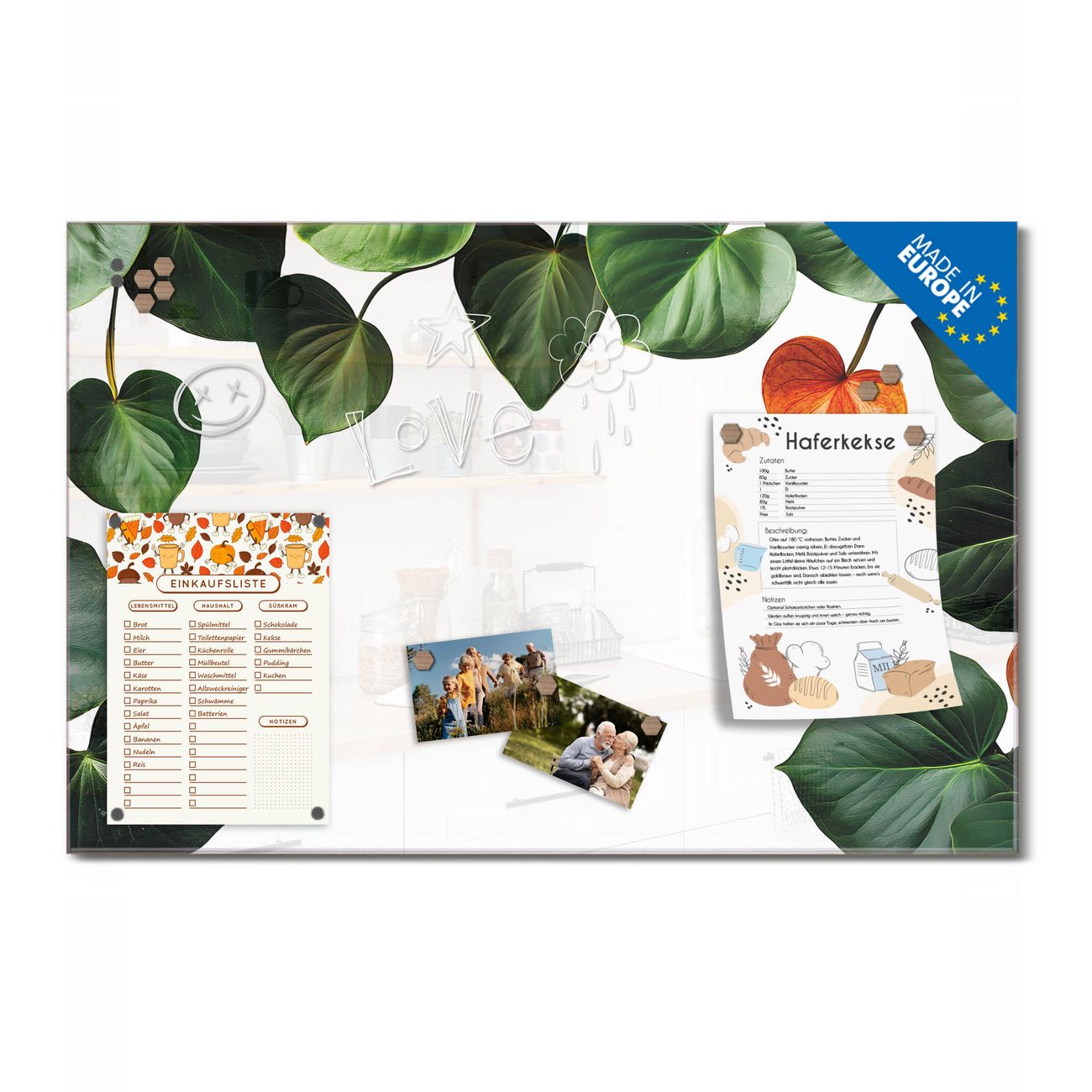 Material: 4mm Sicherheitsglas mit Metallrückwand Eigenschaften: beschreibbar, magnetisch, kratzfest Maße: 75x50x0,6cm, 5,63kg schwer Motiv Nummer 13503 Tropische Blütenpracht Zubehör: inklusive 4 Neodym-Magnete