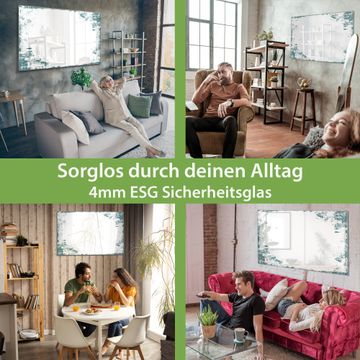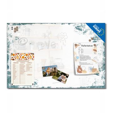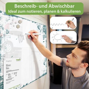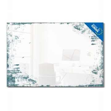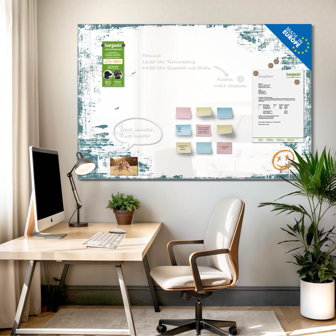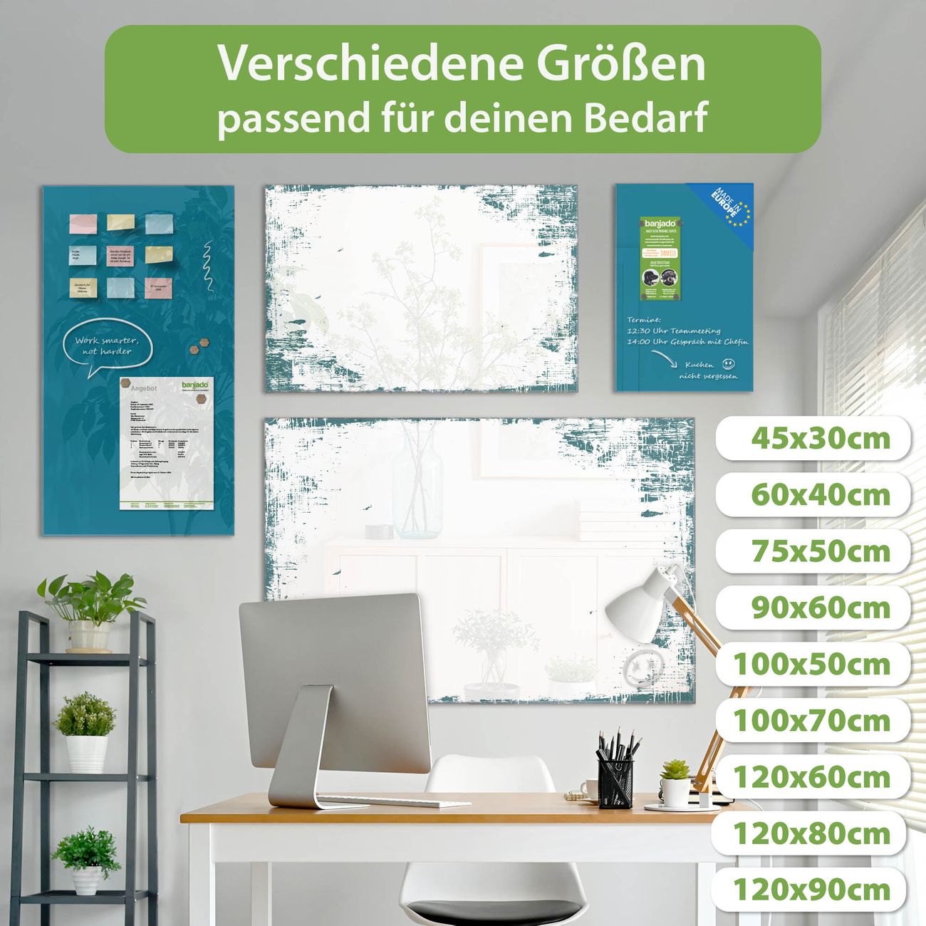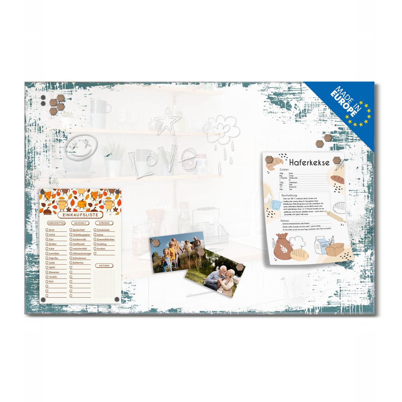 Material: 4mm Sicherheitsglas mit Metallrückwand Eigenschaften: beschreibbar, magnetisch, kratzfest Maße: 75x50x0,6cm, 5,63kg schwer Motiv Nummer 13561 Türkis-Weiße Rahmenstruktur Zubehör: inklusive 4 Neodym-Magnete