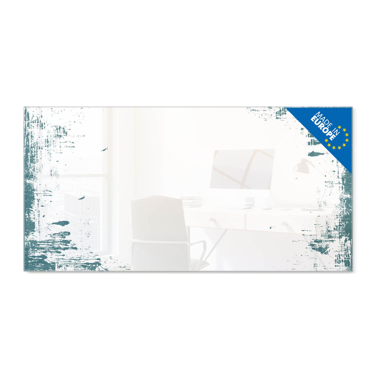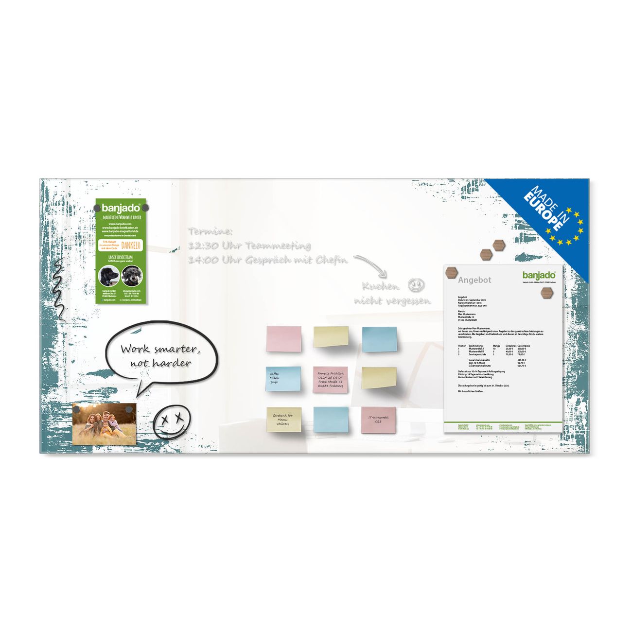 Material: 4mm Sicherheitsglas mit Metallrückwand Eigenschaften: beschreibbar, magnetisch, kratzfest Maße: 100x50x0,6cm, 7,50kg schwer Motiv Nummer 13561 Türkis-Weiße Rahmenstruktur Zubehör: inklusive 4 Neodym-Magnete