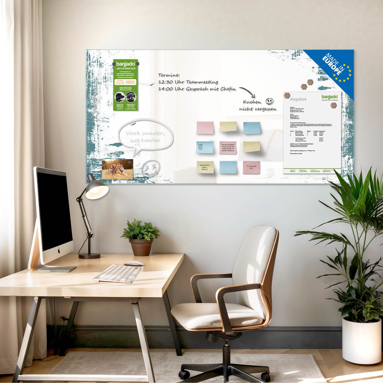 Die banjado Glas Magnettafel mit dem Motiv Motiv Türkis-Weiße Rahmenstruktur verbindet Funktionalität mit Stil. Sie ersetzt das Zettelchaos durch klare Strukturen und bringt dabei eine warme, natürliche Atmosphäre in Ihr Zuhause. Ob im Büro, in der Küche oder im Eingangsbereich - dieses Design-Board zieht Blicke an und sorgt für Ordnung mit Charakter.