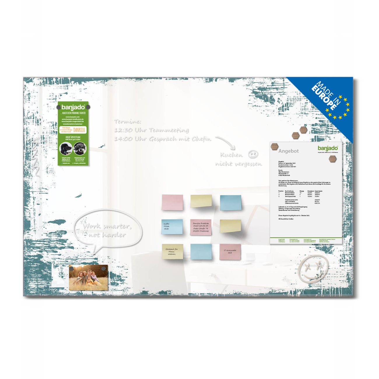 Material: 4mm Sicherheitsglas mit Metallrückwand Eigenschaften: beschreibbar, magnetisch, kratzfest Maße: 120x80x0,6cm, 14,40kg schwer Motiv Nummer 13561 Türkis-Weiße Rahmenstruktur Zubehör: inklusive 4 Neodym-Magnete