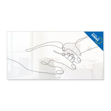 Material: 4mm Sicherheitsglas mit Metallrückwand Eigenschaften: beschreibbar, magnetisch, kratzfest Maße: 100x50x0,6cm, 7,50kg schwer Motiv Nummer 13308 Verbindung der Hände 2 Zubehör: inklusive 4 Neodym-Magnete