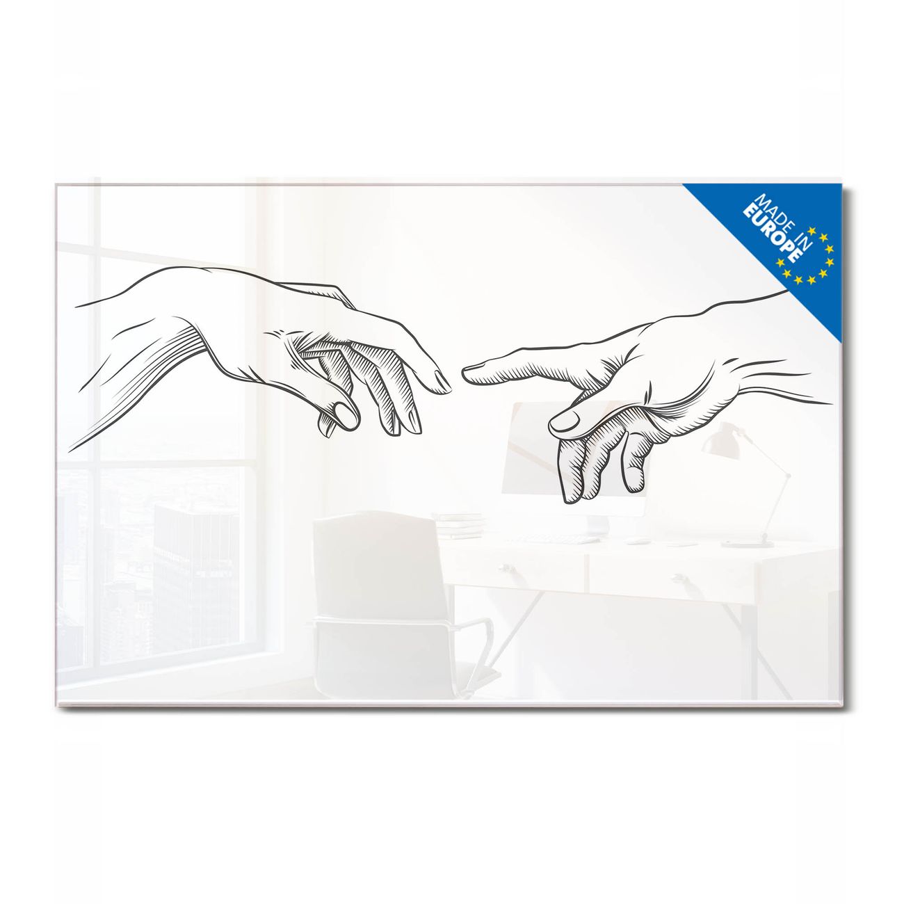 Material: 4mm Sicherheitsglas mit Metallrückwand Eigenschaften: beschreibbar, magnetisch, kratzfest Maße: 75x50x0,6cm, 5,63kg schwer Motiv Nummer 13268 Verbindung der Hände Zubehör: inklusive 4 Neodym-Magnete