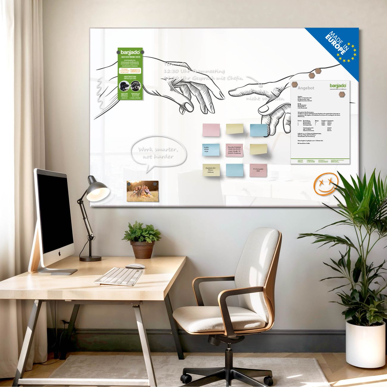 Jede Glas Magnettafel wird in unserer Werkstatt von Hand gefertigt und sorgfältig geprüft. So erhalten Sie ein echtes Qualitätsprodukt, das Funktion und Ästhetik perfekt vereint.?? Warum banjado?