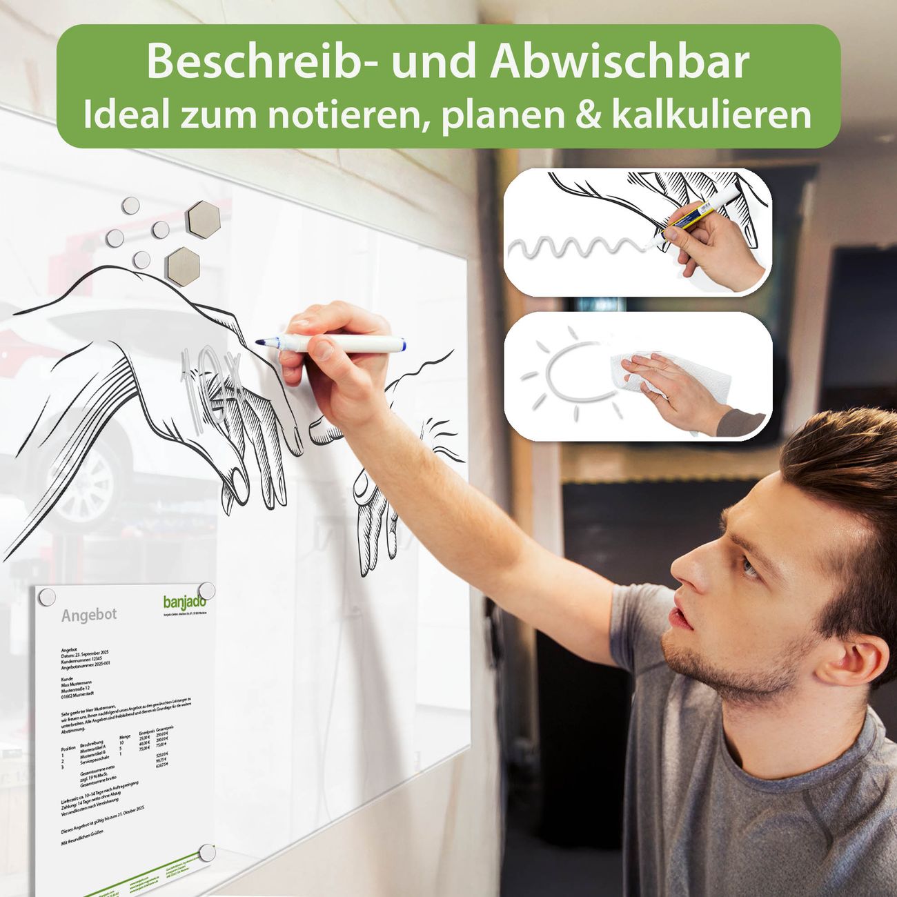 Bitte beachten Sie, dass ausschliessliche spezielle Magnete an der Glastafel haften. Wir empfehlen banjado Neodym Magnete, diese sind durch uns auf Wirksamkeit geprüft.