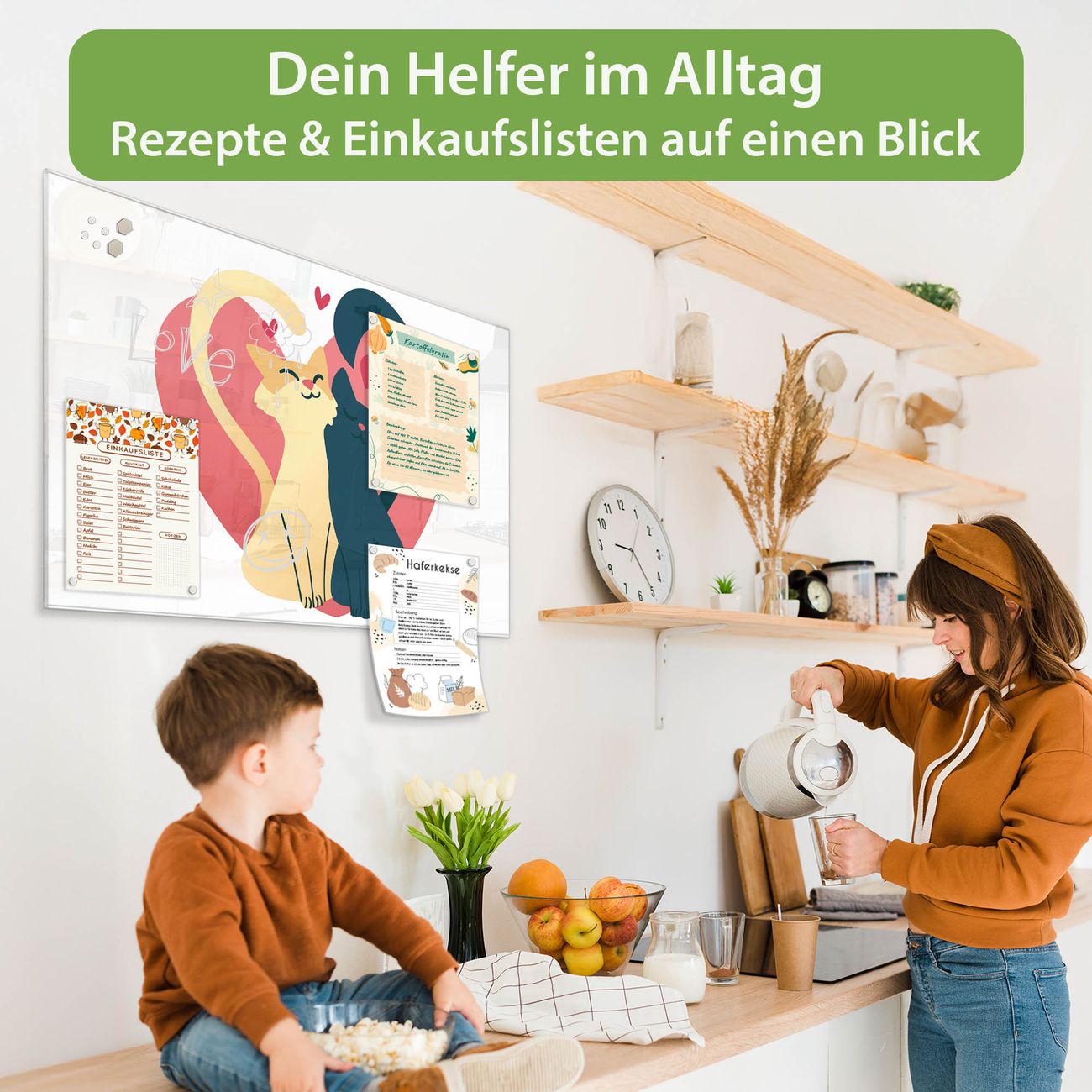 Ein Stück Design, das Ihren Alltag organisiert. Schreiben, heften, inspirieren - alles an einem Ort. Qualität, die man spürt. Montage leicht gemacht. Handwerk mit Herz - veredelt in Sachsen. Einzigartiges Design mit Motiv Motiv Verliebte Katzen Beschreibbare Glasoberfläche, leicht zu reinigen Starke Magnetkraft durch Stahlrückwand Inklusive 4 Neodym-Magneten Flexible Montageoptionen Handveredelt in Sachsen - Qualität, die bleibt