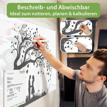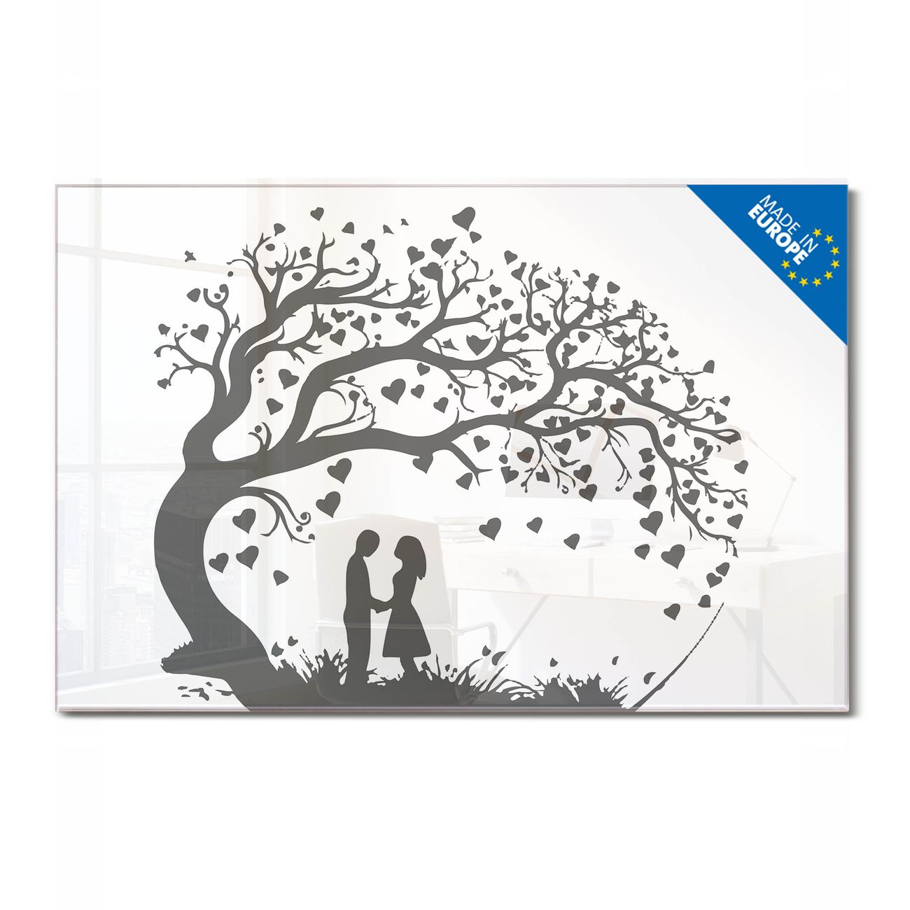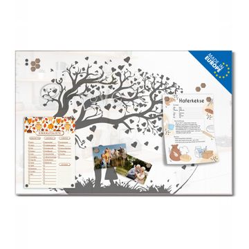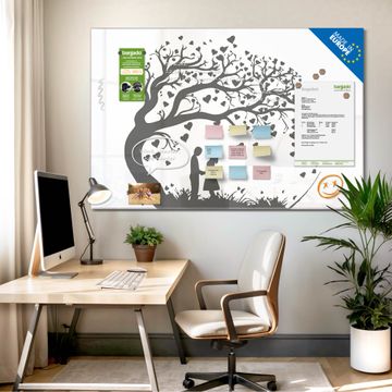 Material: 4mm Sicherheitsglas mit Metallrückwand Eigenschaften: beschreibbar, magnetisch, kratzfest Maße: 75x50x0,6cm, 5,63kg schwer Motiv Nummer 13353 Verliebter Baum Zubehör: inklusive 4 Neodym-Magnete