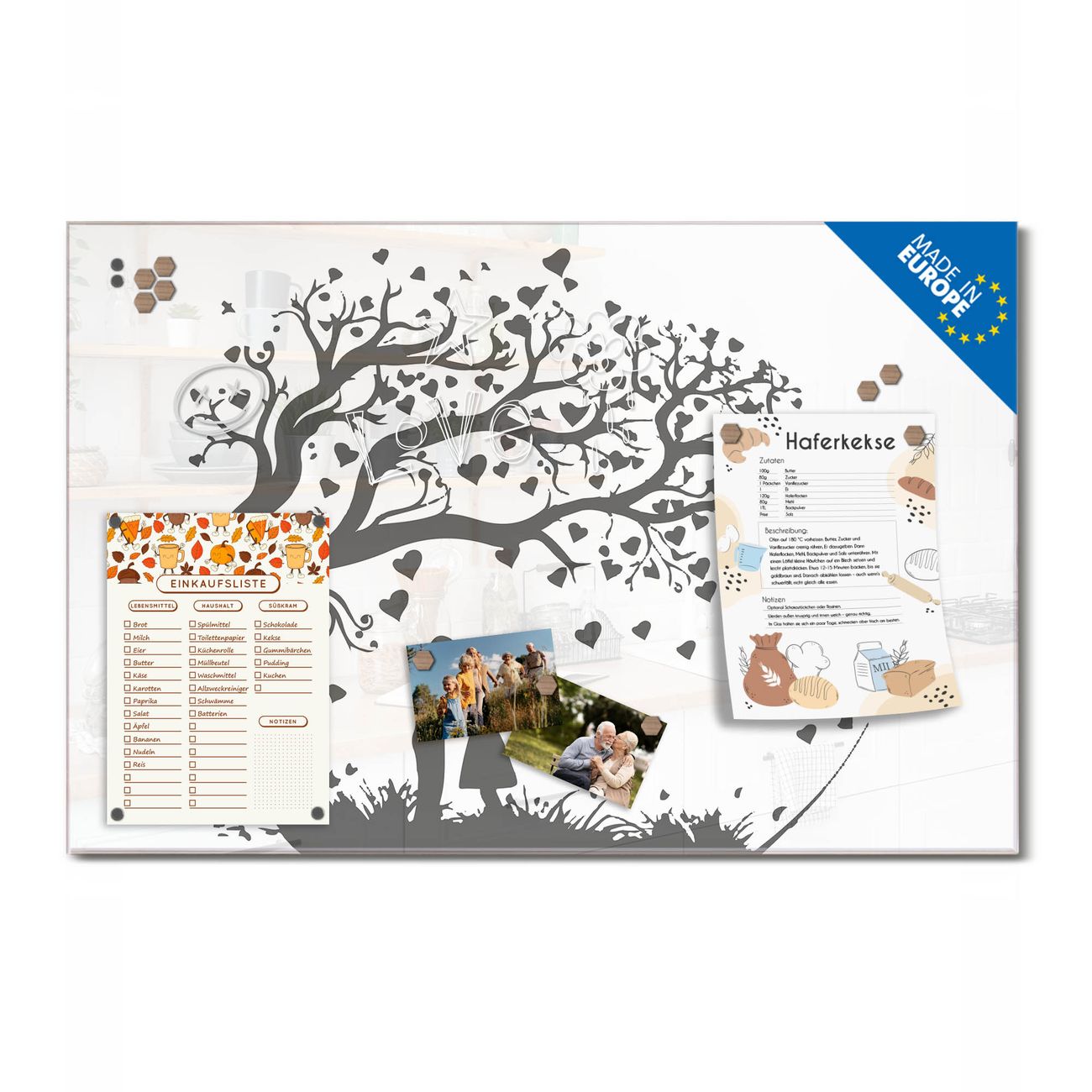 Ein Stück Design, das Ihren Alltag organisiert. Schreiben, heften, inspirieren - alles an einem Ort. Qualität, die man spürt. Montage leicht gemacht. Handwerk mit Herz - veredelt in Sachsen. Einzigartiges Design mit Motiv Motiv Verliebter Baum Beschreibbare Glasoberfläche, leicht zu reinigen Starke Magnetkraft durch Stahlrückwand Inklusive 4 Neodym-Magneten Flexible Montageoptionen Handveredelt in Sachsen - Qualität, die bleibt