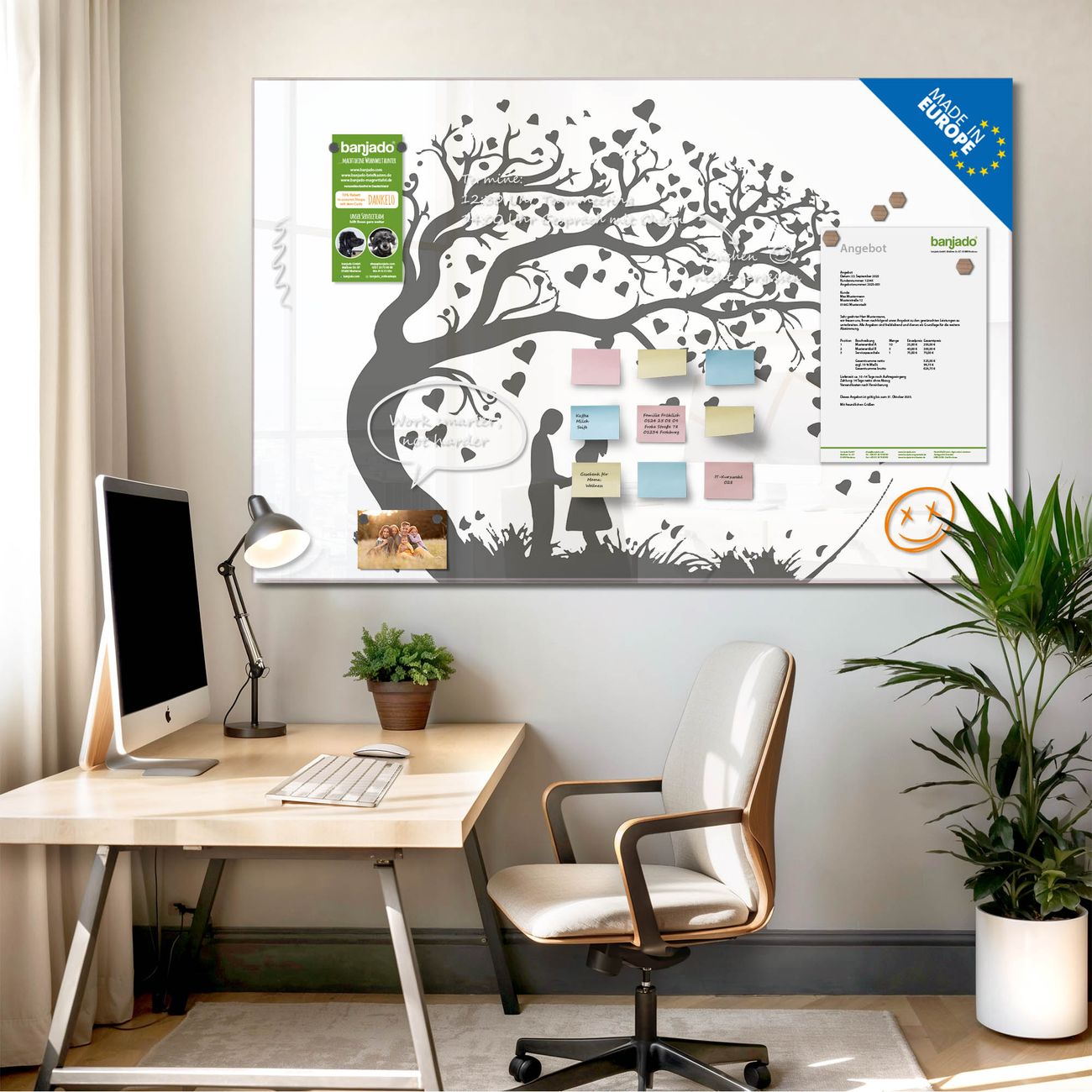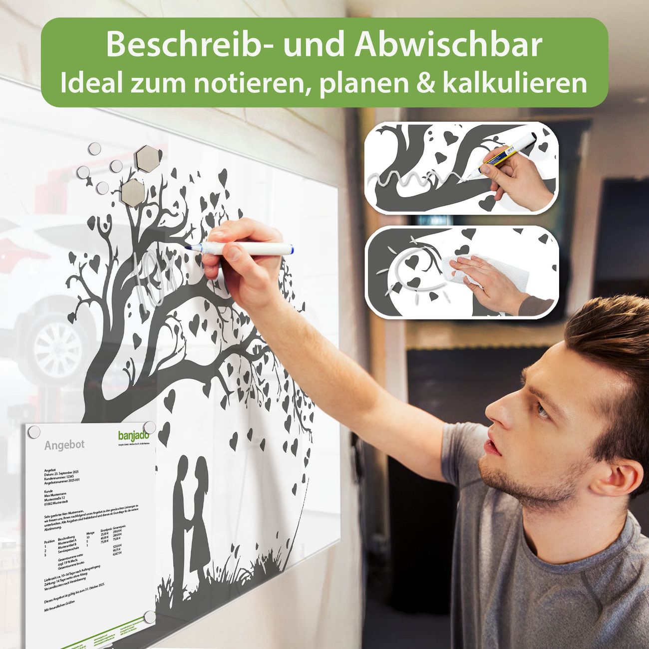 Jede Glas Magnettafel wird in unserer Werkstatt von Hand gefertigt und sorgfältig geprüft. So erhalten Sie ein echtes Qualitätsprodukt, das Funktion und Ästhetik perfekt vereint.?? Warum banjado?