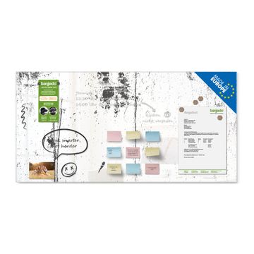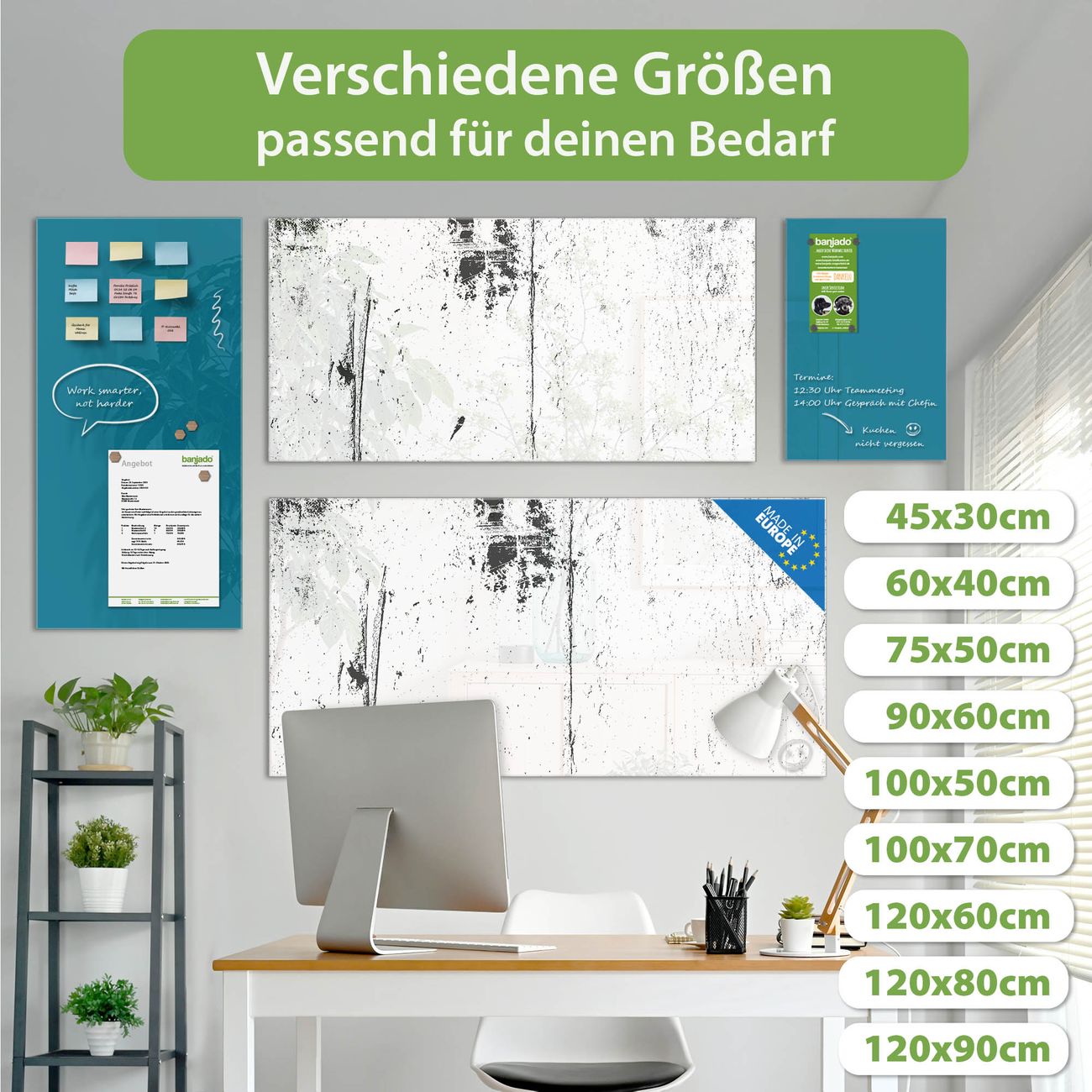 Material: 4mm Sicherheitsglas mit Metallrückwand Eigenschaften: beschreibbar, magnetisch, kratzfest Maße: 100x50x0,6cm, 7,50kg schwer Motiv Nummer 13564 Verwitterte Wand Zubehör: inklusive 4 Neodym-Magnete